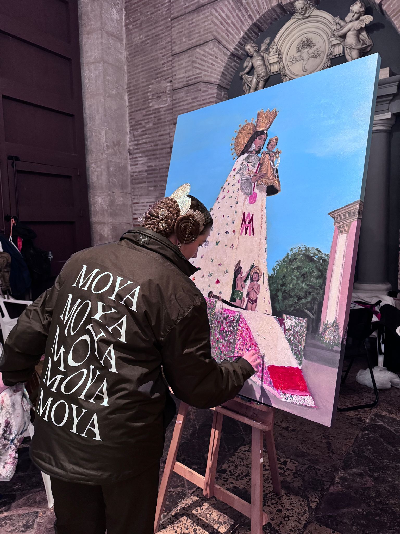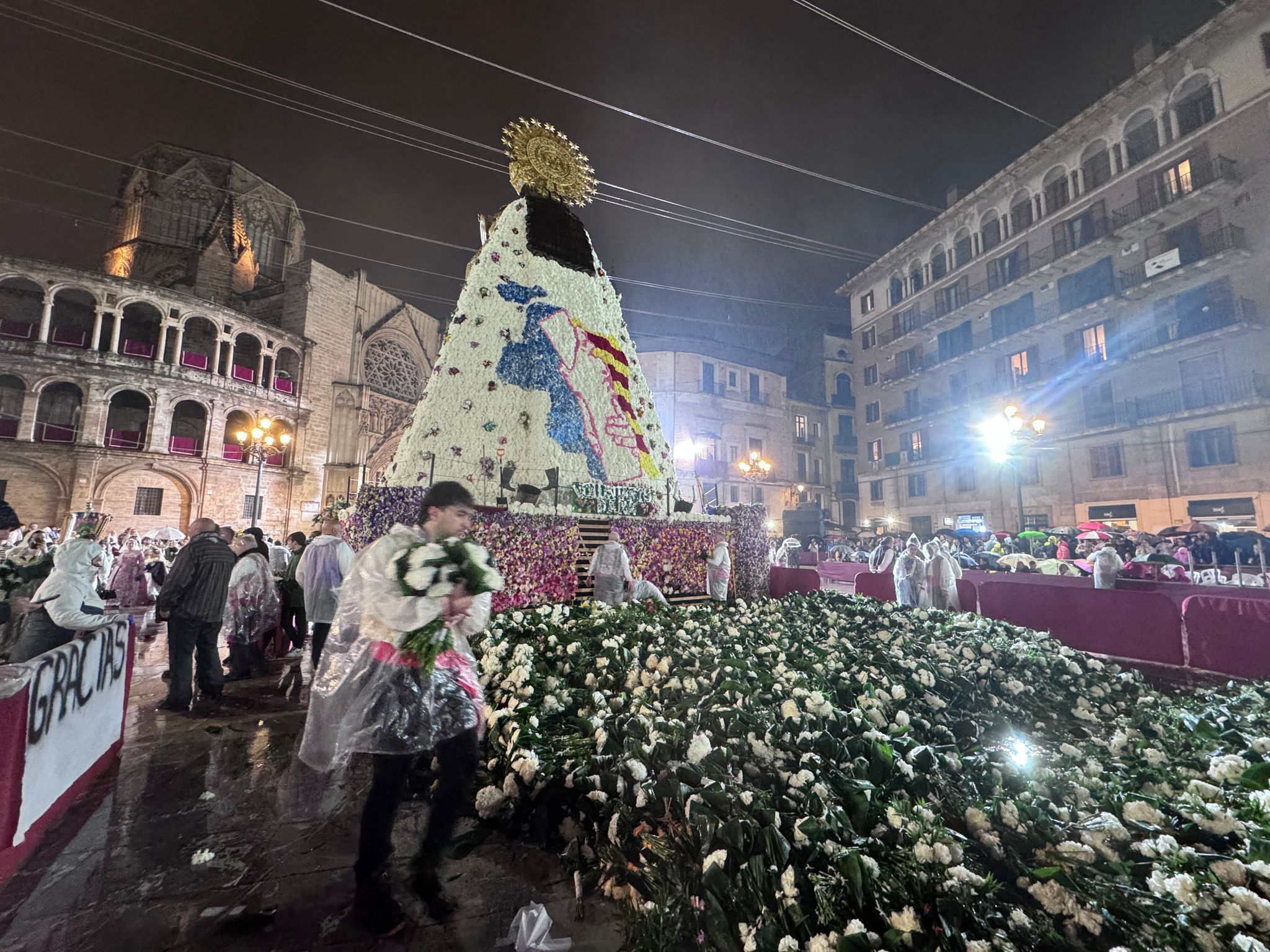 Allí les espera una inmensa reproducción de la «Geperudeta» cuyo manto se va tiñendo del color de las flores; los millares de falleros y falleras que pasan por delante de la Virgen de los Desamparados gigante, entregan sus ramos a un experimentado equipo que trepa por la estructura y los va colocando estratégicamente.