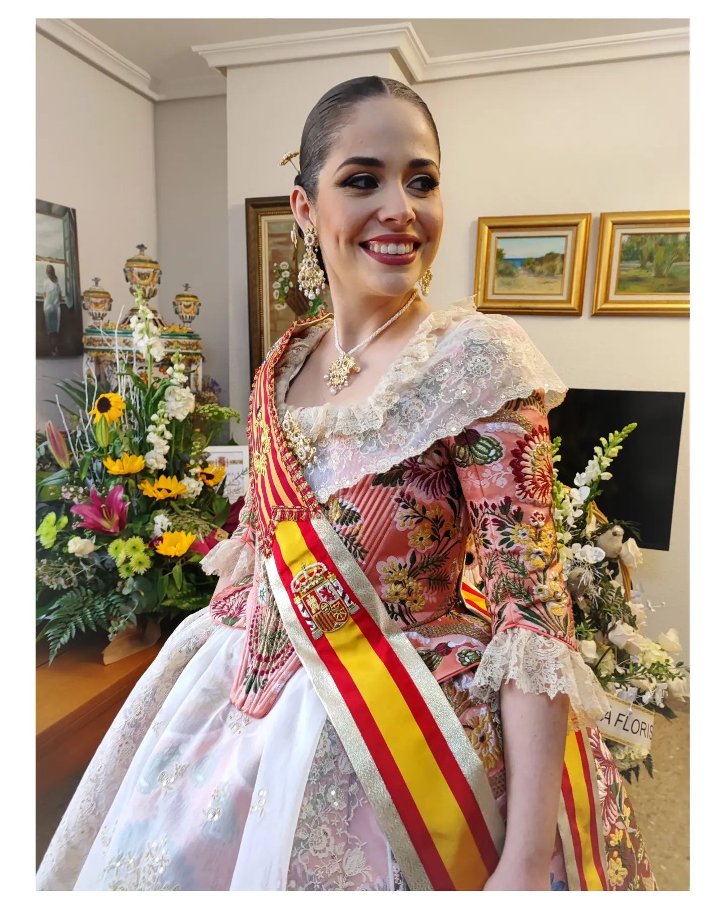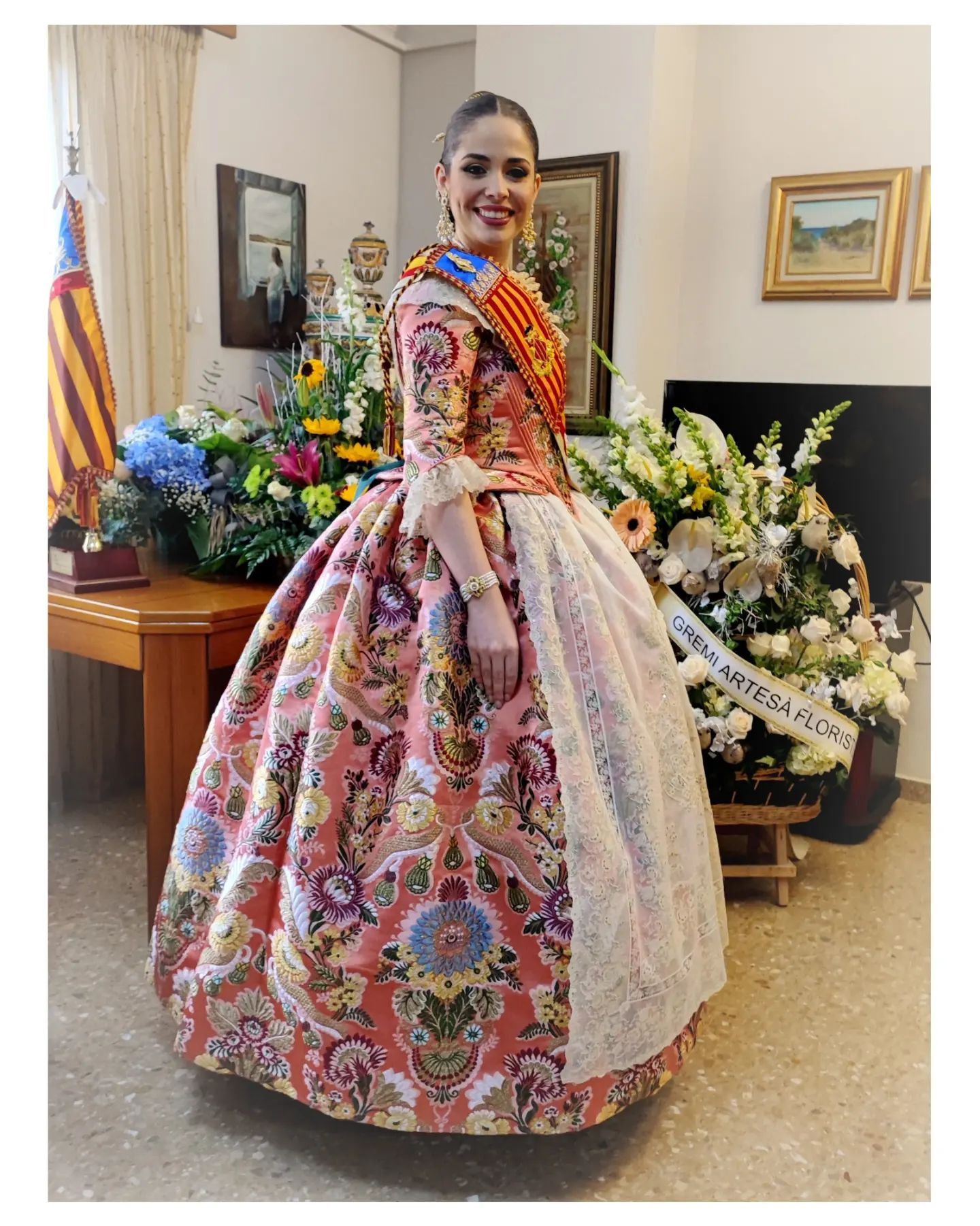 La Fallera Mayor de València Carmen Martín Carbonell ha estrenado su segundo traje oficial para la exaltación de Nerea López como Fallera Mayor Infantil. Carmen ha lucido un estrecho de seda color siena tostado de Bartual Tejedores con manteletas de cadeneta artesanal y encajes de Artesania Viana y un aderezo de Art Antic Joieria.