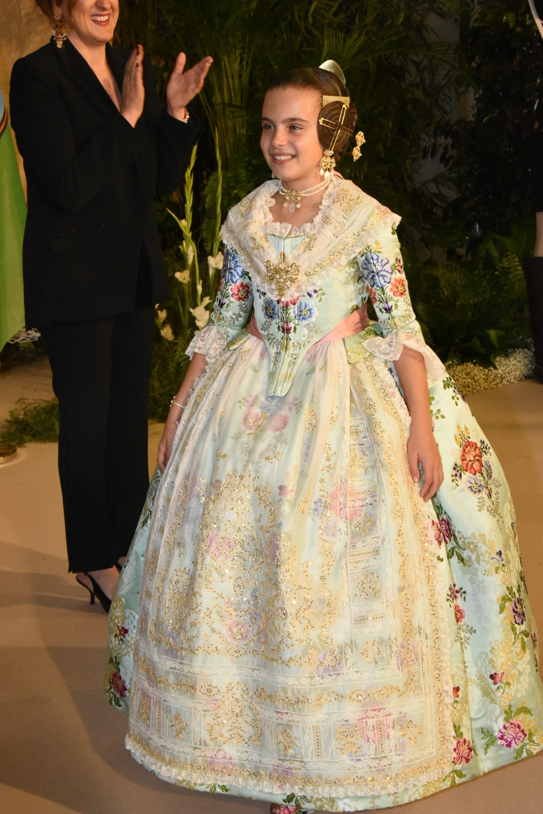 Claudia Ravello, Fallera Mayor de la Falla Conde Salvatierra Cirilo Amorós, deslumbró con su elegancia impecable para la exaltación de su Fallera Mayor Infantil.