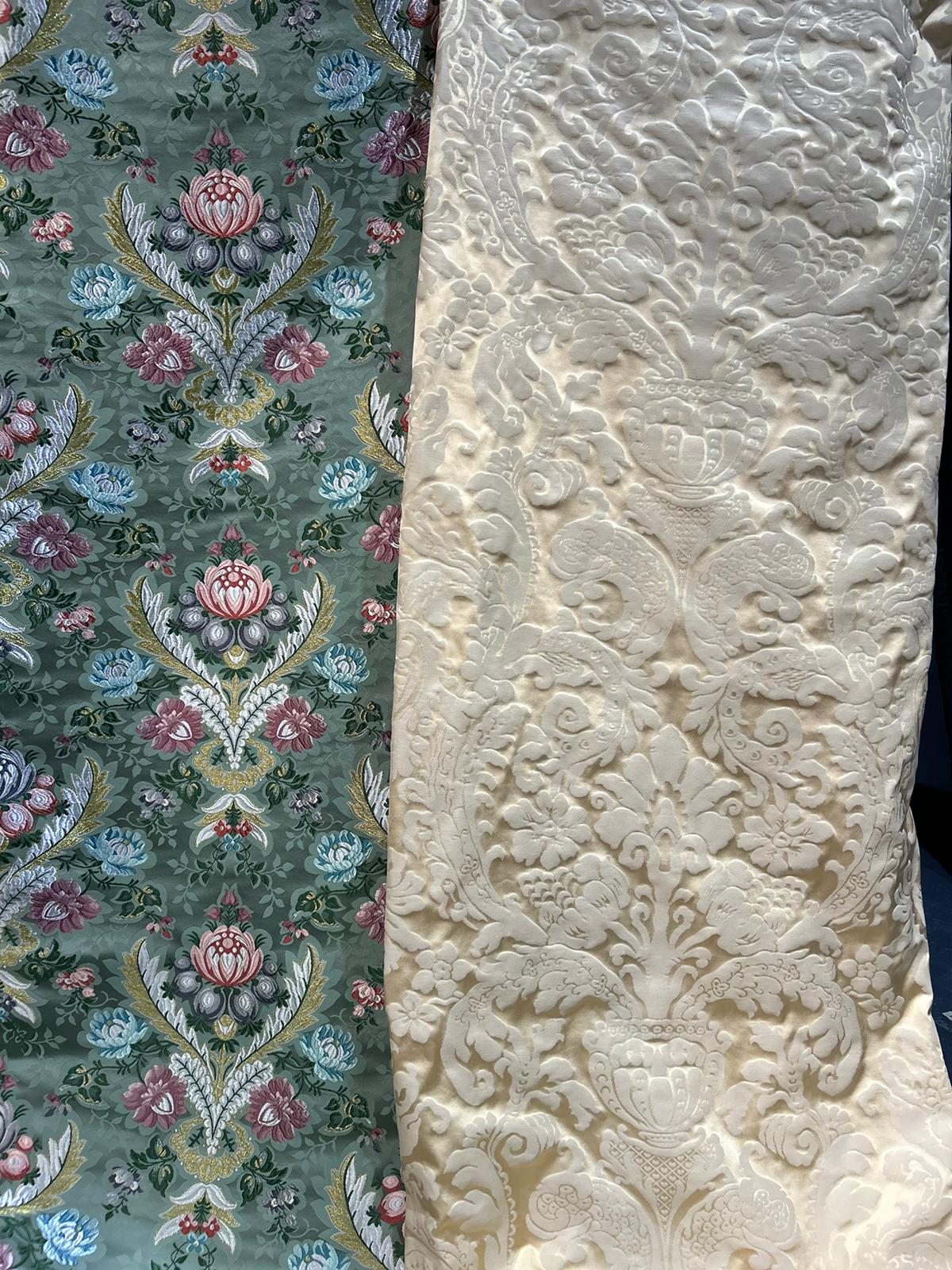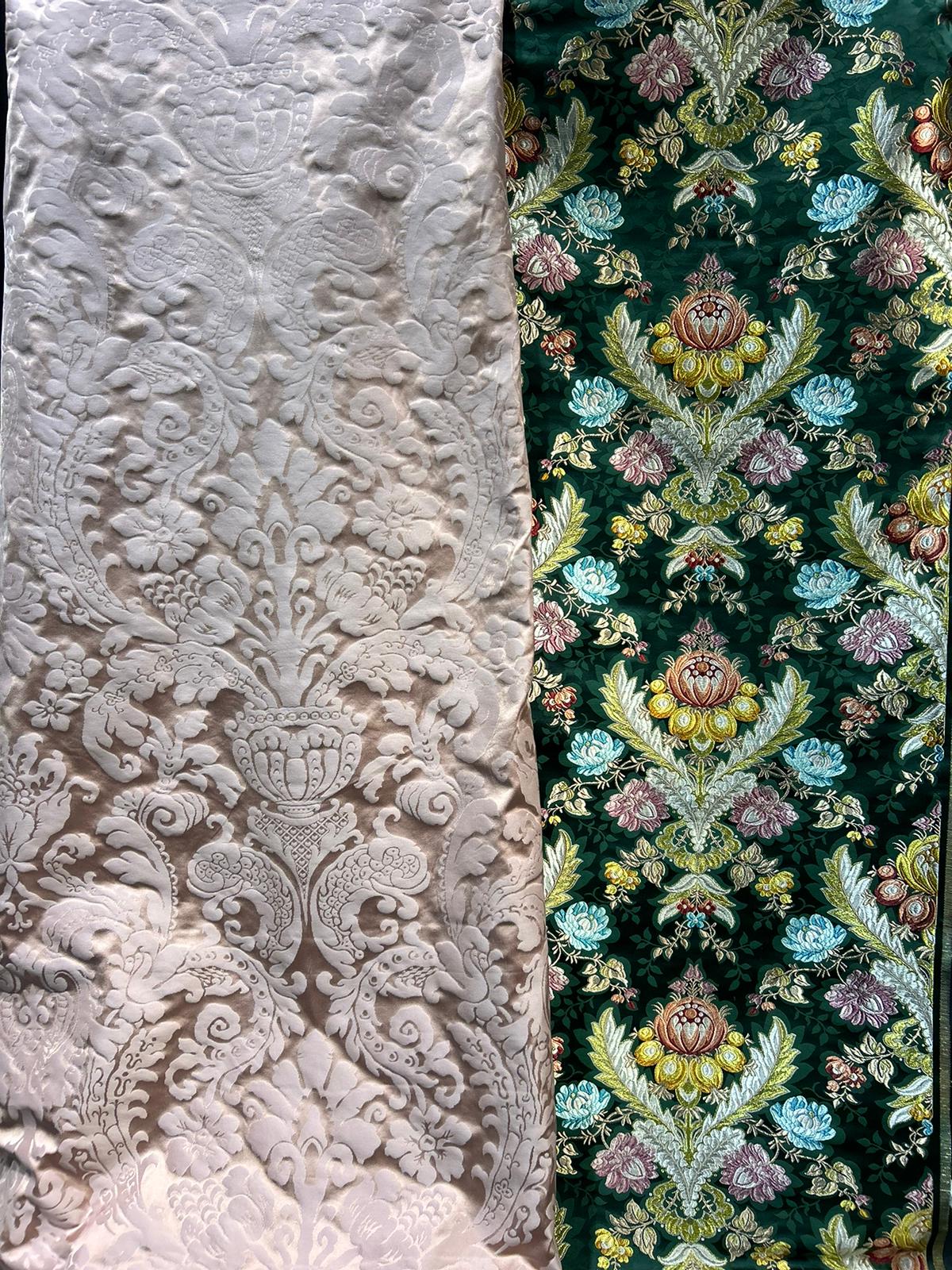 En cuanto a la tela que la firma ha escogido para el segundo traje oficial, se trata de un damasco de viscosa que lleva por nombre “Estambul”, un dibujo que la casa ha recuperado del archivo de
