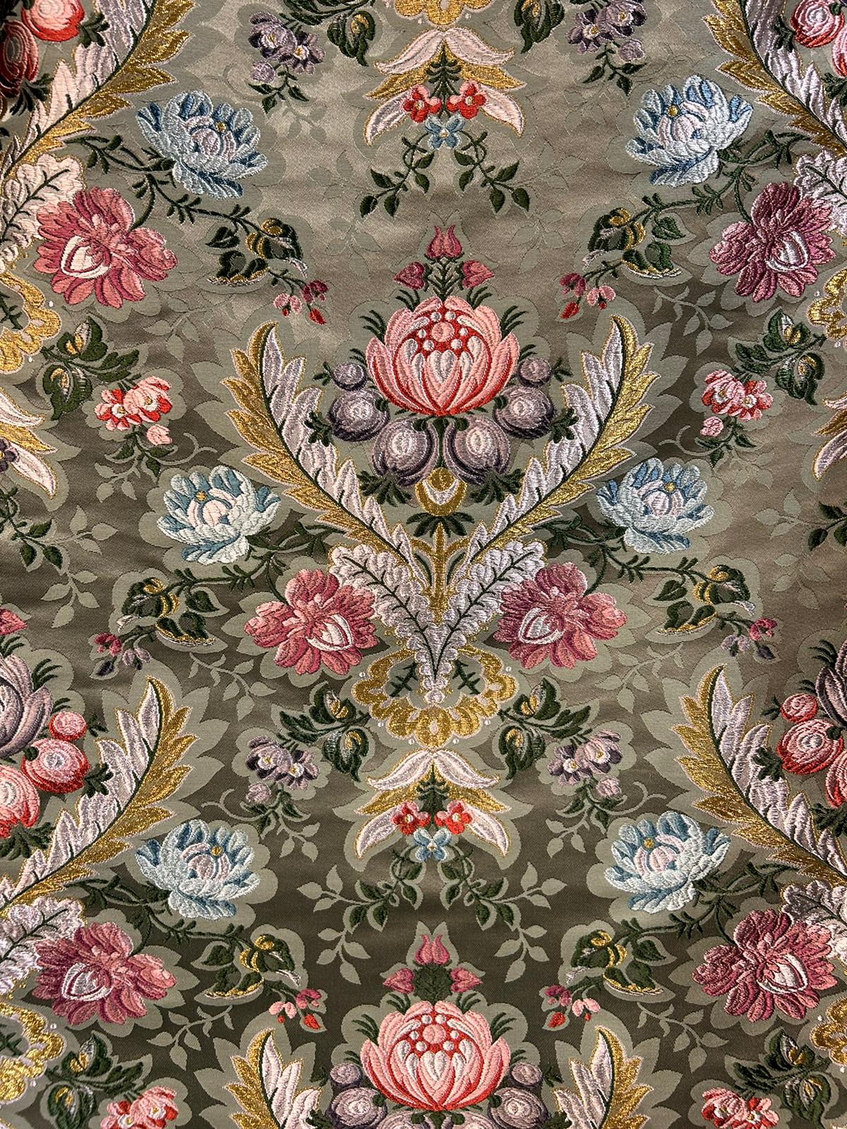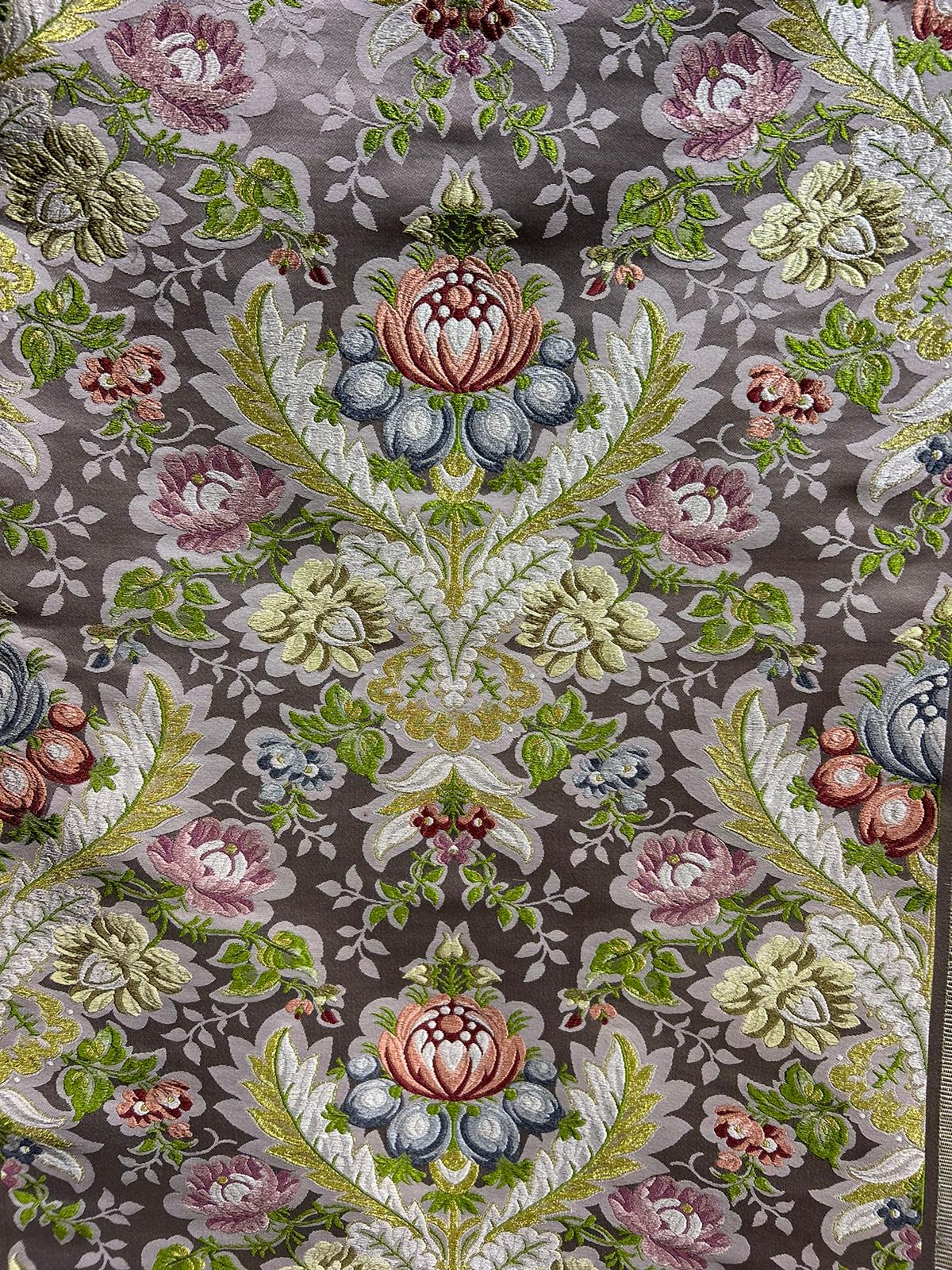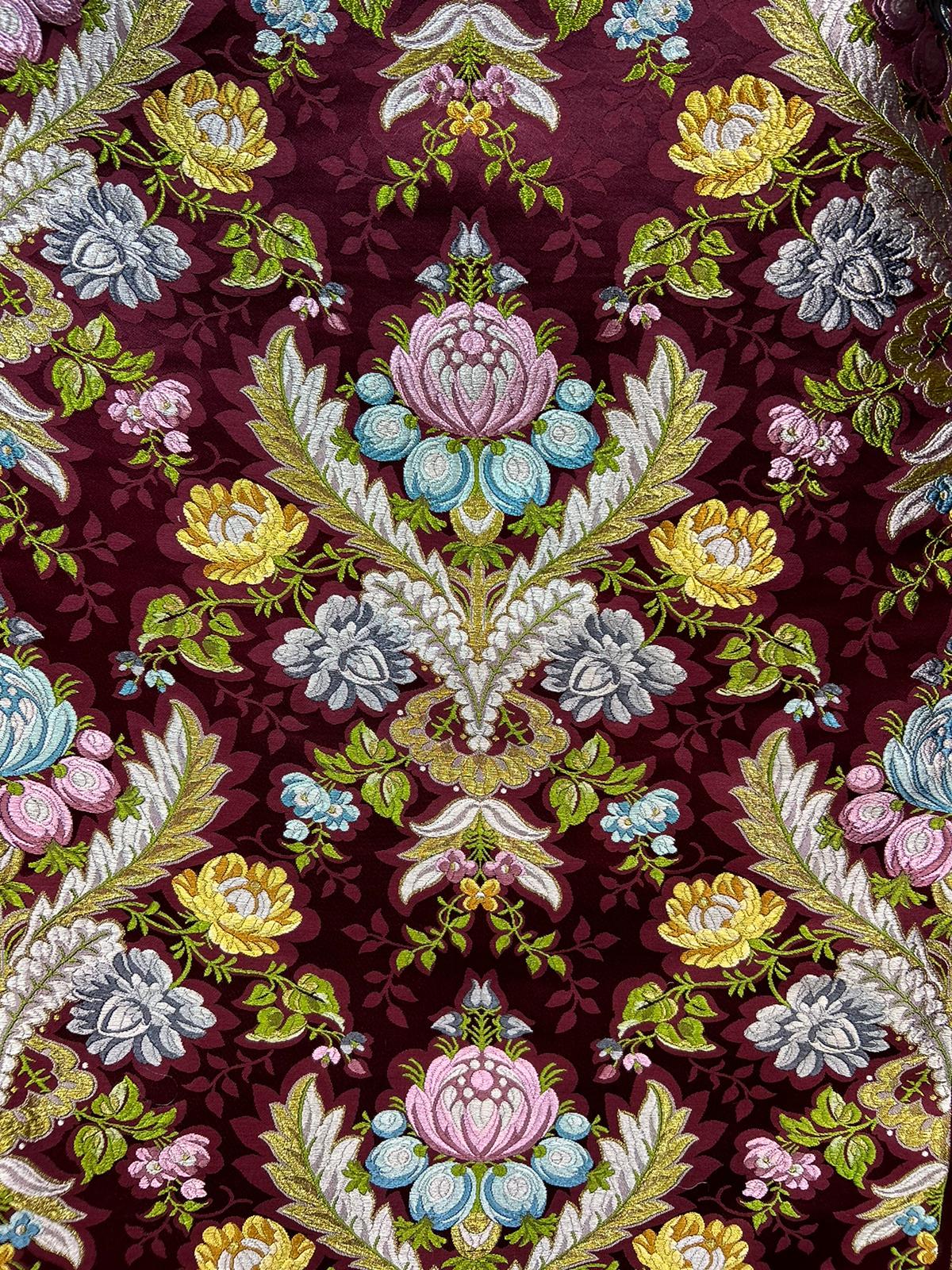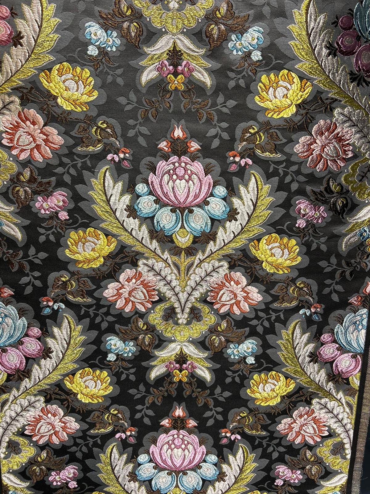 El espectacular espolín de Berta Peiró destaca por su sofisticado diseño en seda natural, con un color de fondo melanzane que mezcla púrpura y marrón, aportando lujo y creatividad. Con 6.210 hilos de urdimbre y 36 colores de trama, incorpora metales como oro volteado y plata vieja, logrando una apariencia cálida y elegante. Sus motivos florales y ornamentales, realzados por tonos dorados, reflejan arte, tradición y una meticulosa creatividad en sus 13 metros de tejido.