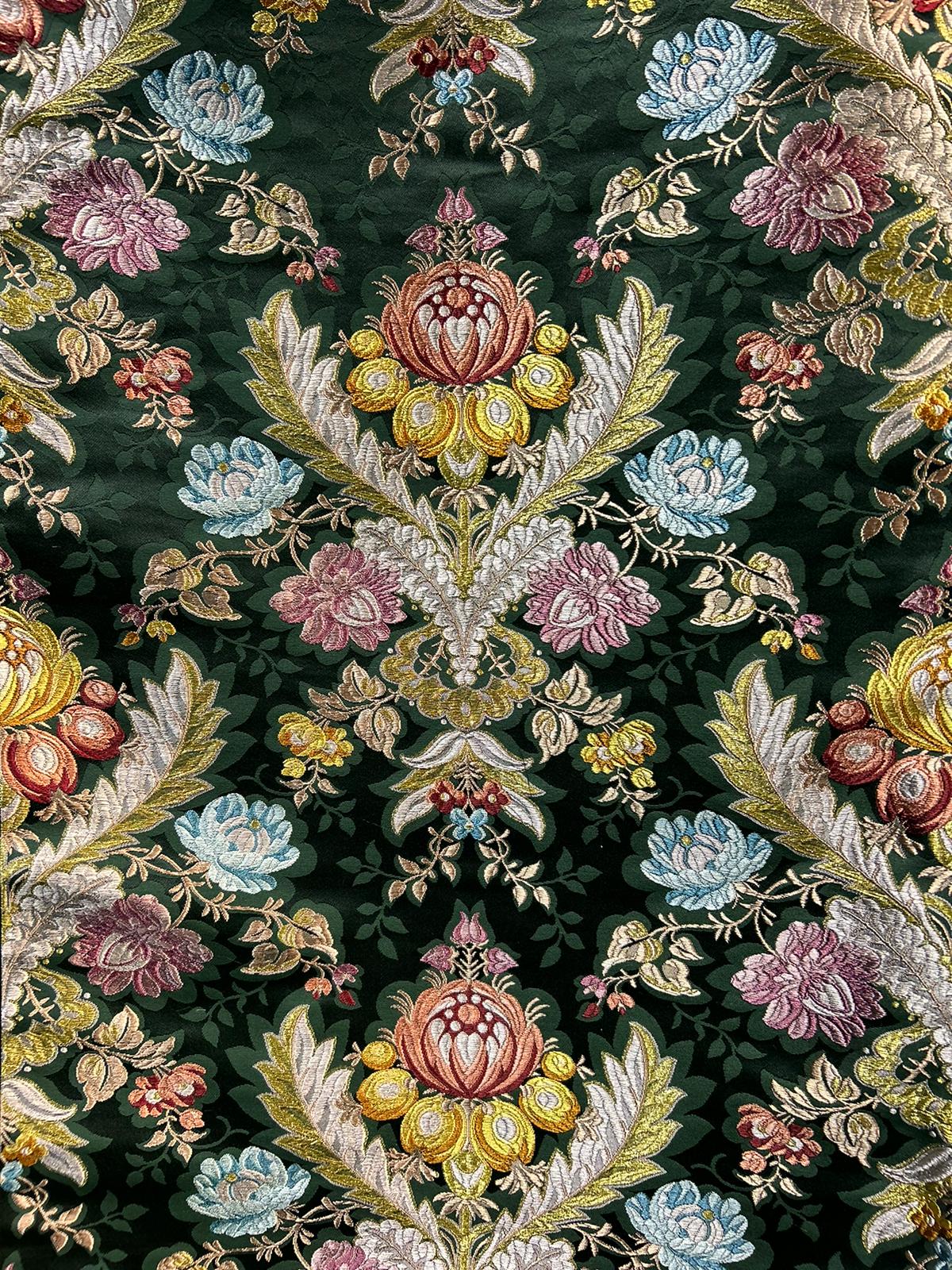 El dibujo ‘Corona’ al no llevar orlas o guirnaldas la hace menos común, pero sin romper la ortodoxia que supone nuestra indumentaria. Los frutos que destacan con la flor central es uno de los elementos que hacen de este tejido más especial, más único y diferente.