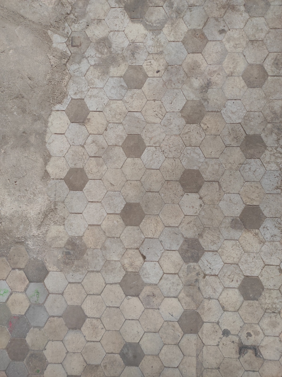 • Pavimento original de mosaico Nolla, compuesto por baldosines hexagonales de colores variados y patrones geométricos, oculto bajo un suelo posterior.