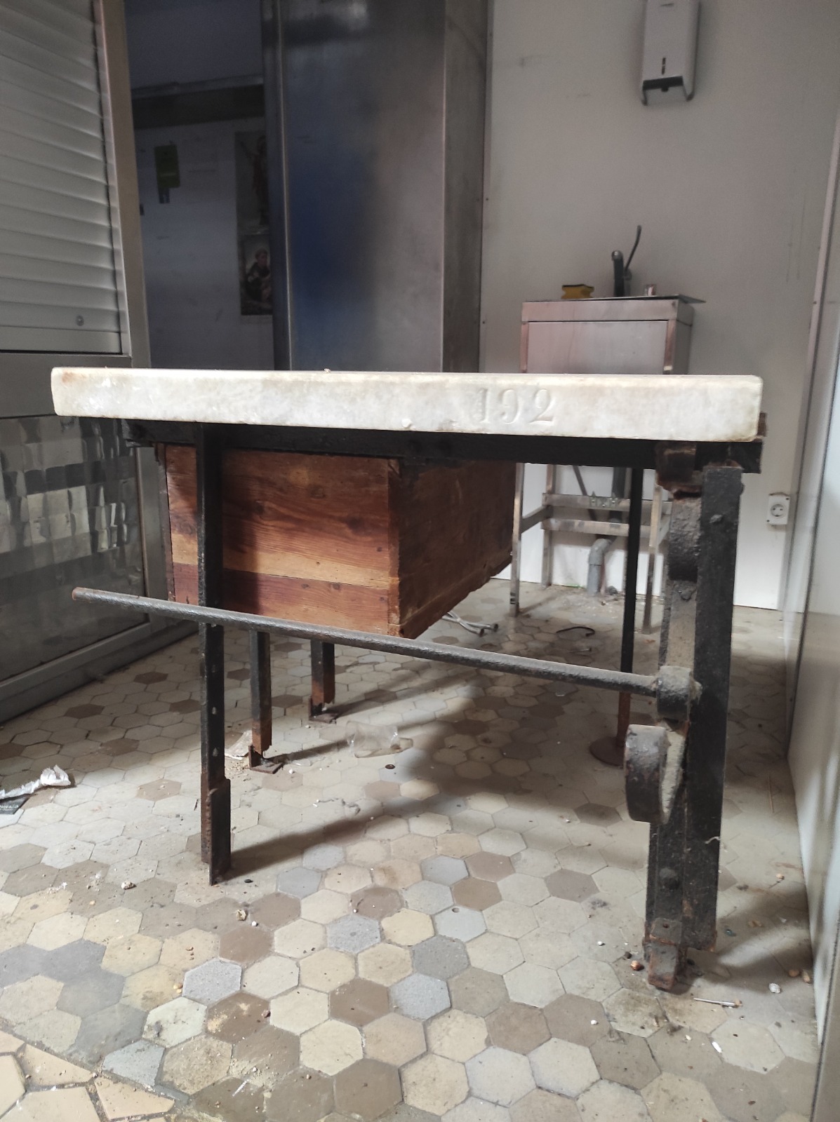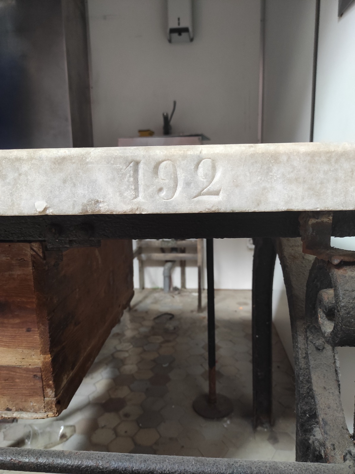 • Mesa de mármol con bancada y estructura de forja, completa con un cajón y con el número 192 grabado en la piedra, que formaba parte del mobiliario original del mercado.