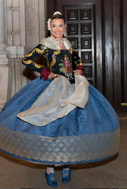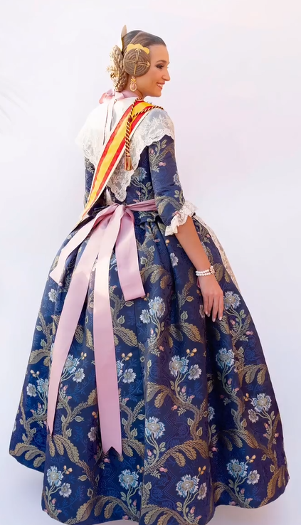 En la Gala de la Cultura, la Fallera Mayor estrenó un modelo Solidaritat en azul, diseñado por Jorge Faubel, con una confección que realza la riqueza del tejido.