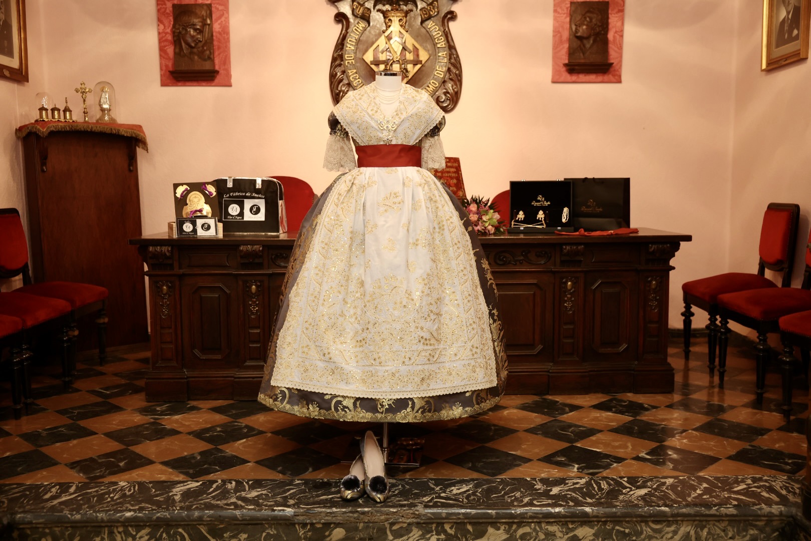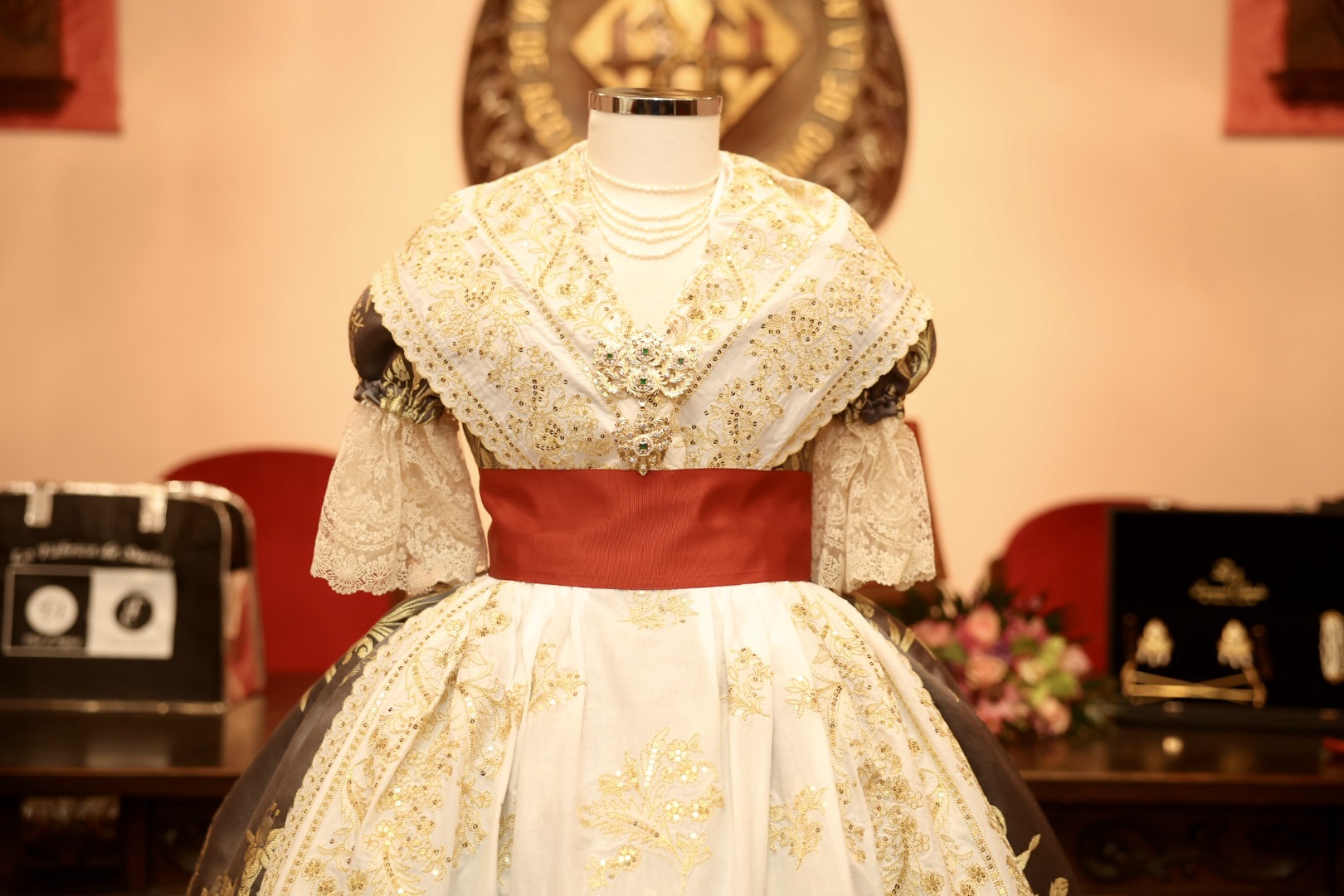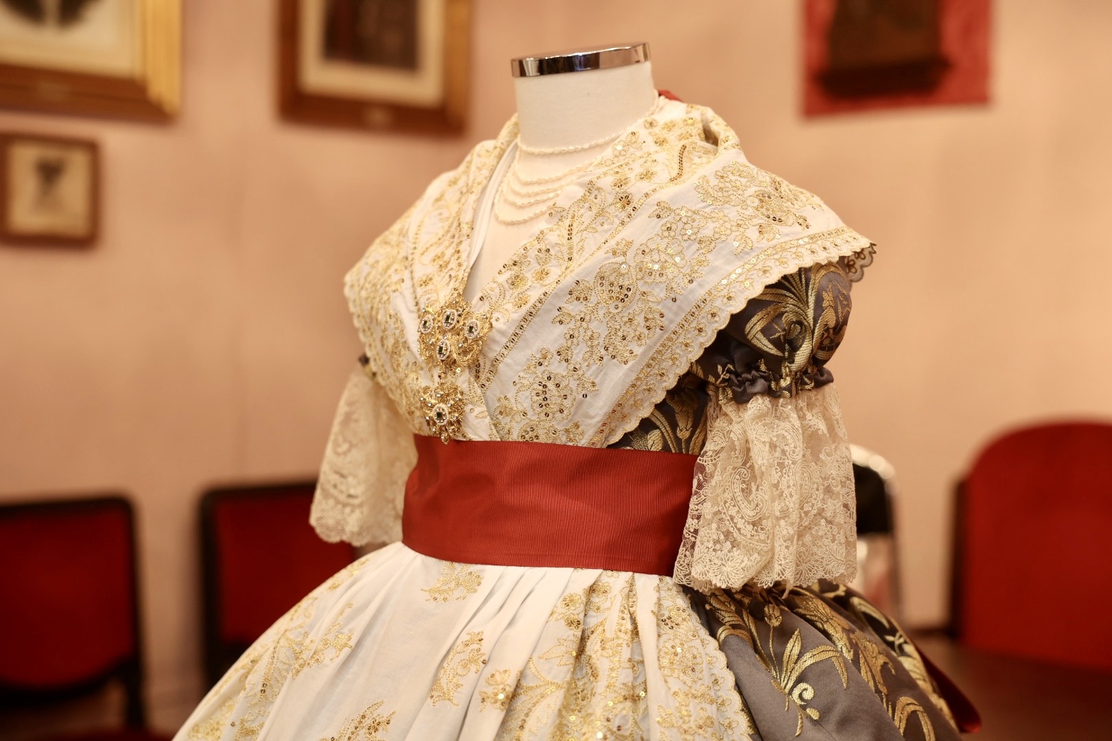 Se trata de un traje de valenciana de finales del s. XIX y principios del s. XX, con mangas de farol. La tela es un brocatel de seda estrecha y el dibujo “Azucena” tejido por Compañía Valenciana de la Seda. La urdimbre es en fondo marengo y la trama se ha trabajado de manera muy especial, mezclando hilo metálico de color oro y seda color marfil, consiguiendo que sea el metal más suave en el dibujo que destaca por sus azucenas y sus finas hojas que parecen estar en movimiento.