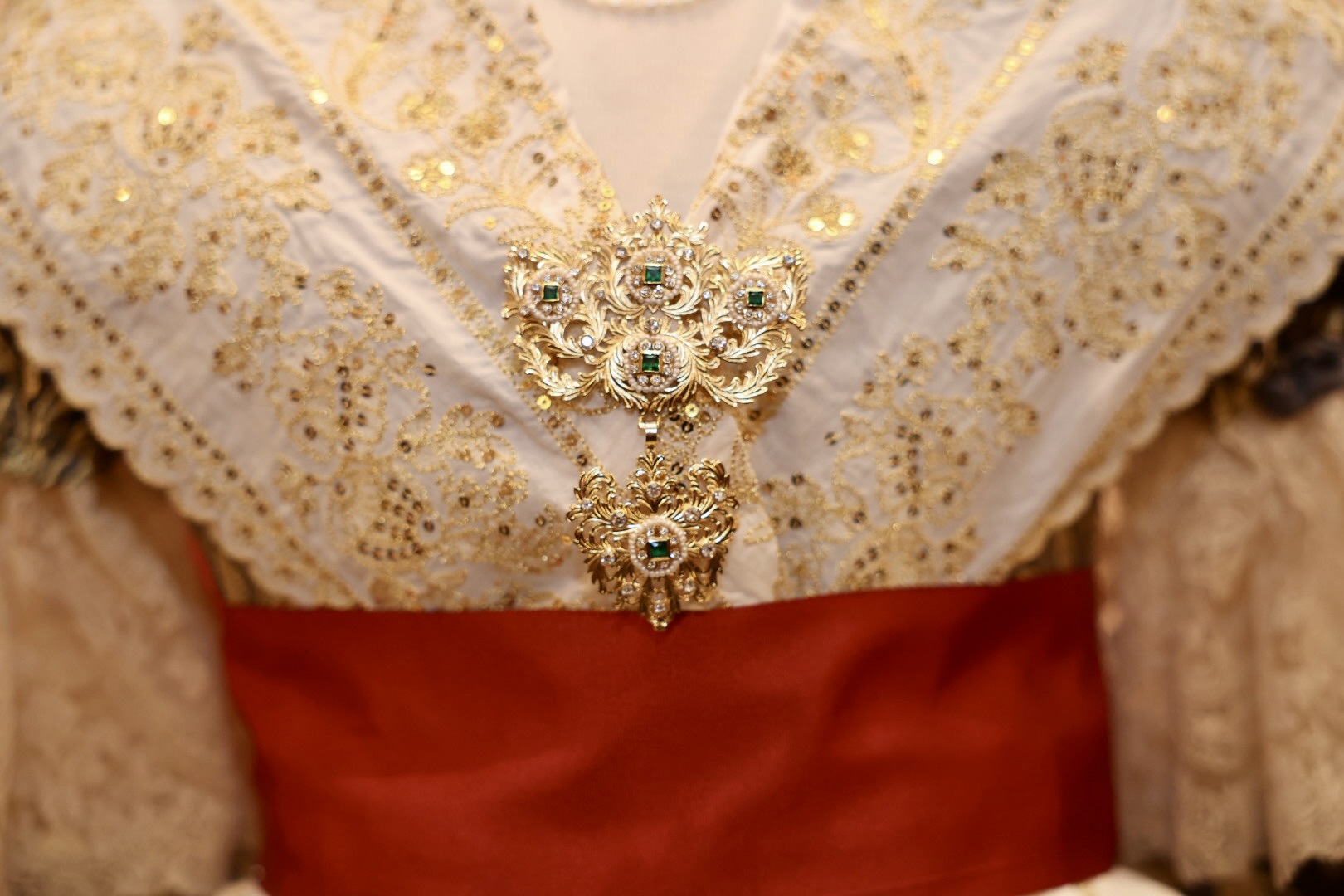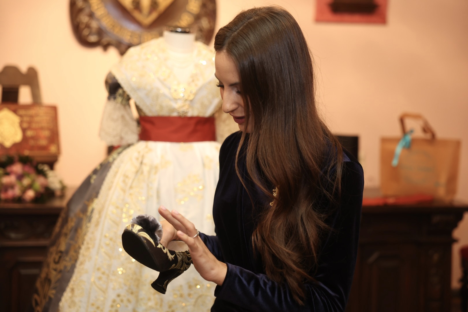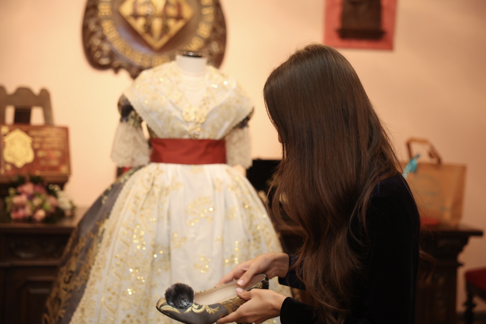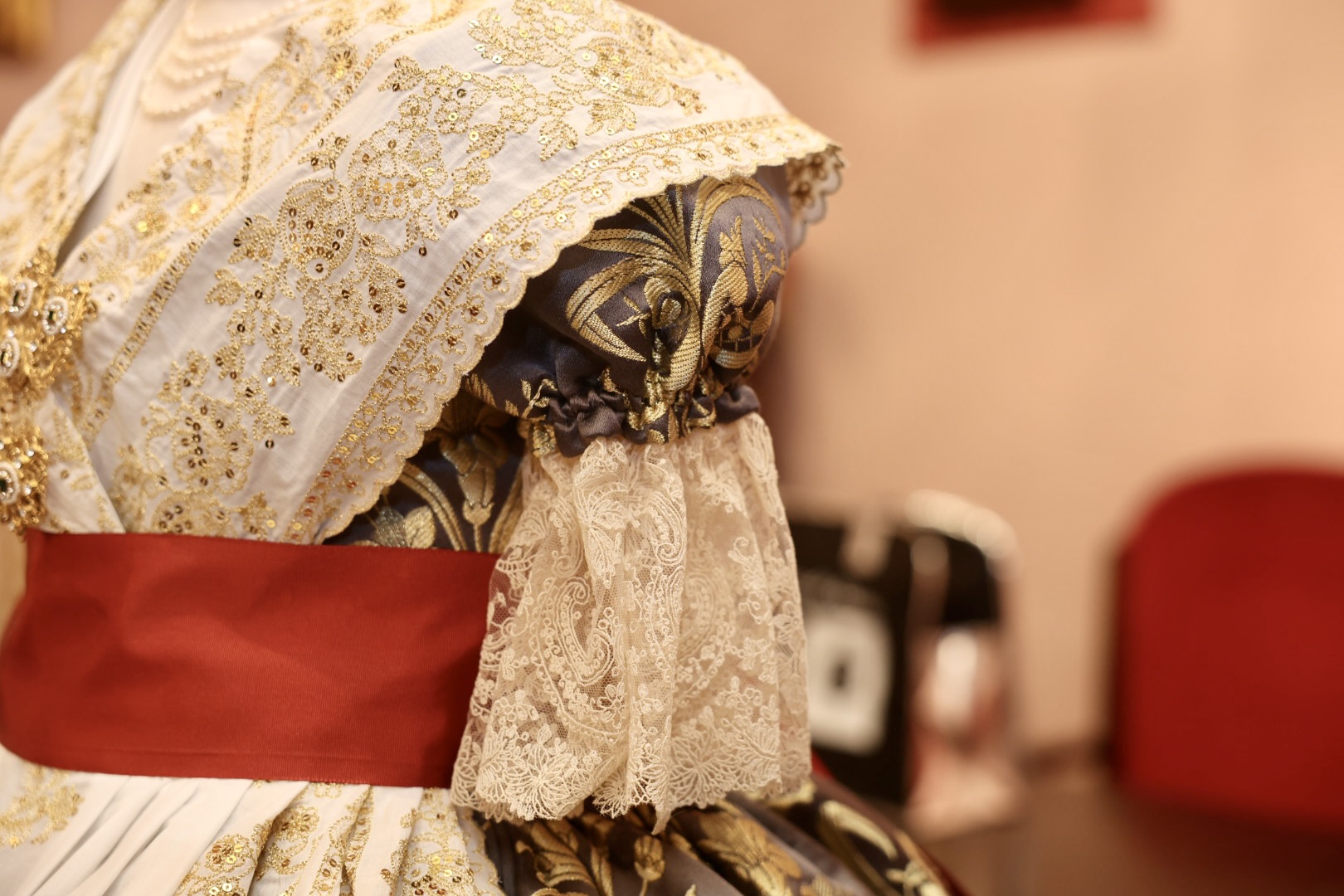 Se trata de un traje de valenciana de finales del s. XIX y principios del s. XX, con mangas de farol. La tela es un brocatel de seda estrecha y el dibujo “Azucena” tejido por Compañía Valenciana de la Seda. La urdimbre es en fondo marengo y la trama se ha trabajado de manera muy especial, mezclando hilo metálico de color oro y seda color marfil, consiguiendo que sea el metal más suave en el dibujo que destaca por sus azucenas y sus finas hojas que parecen estar en movimiento.