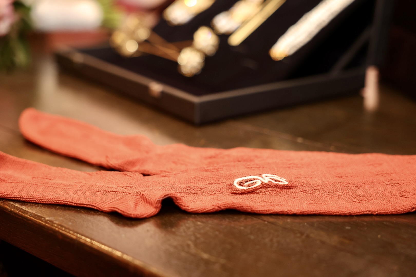 El juego de delantal y manteleta realizado por Hijas de Carmen Esteve está inspirado en un dibujo con motivos florales rematados con líneas rectas, bordado sobre una base de batista e hilo de seda crudo. Todo ello se enmarca con hilo dorado para definir mejor el propio dibujo.