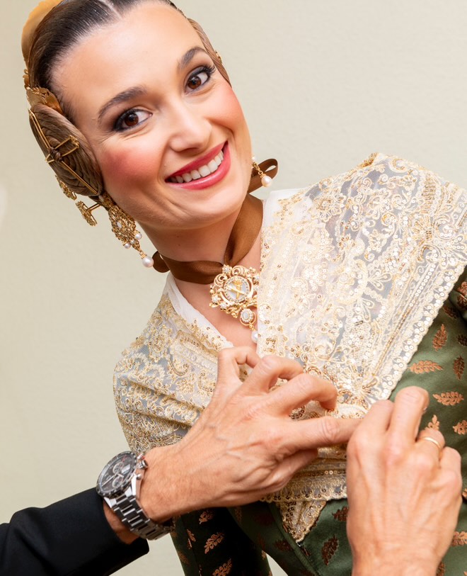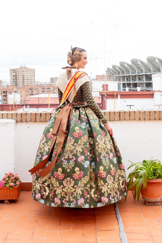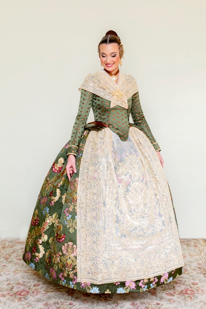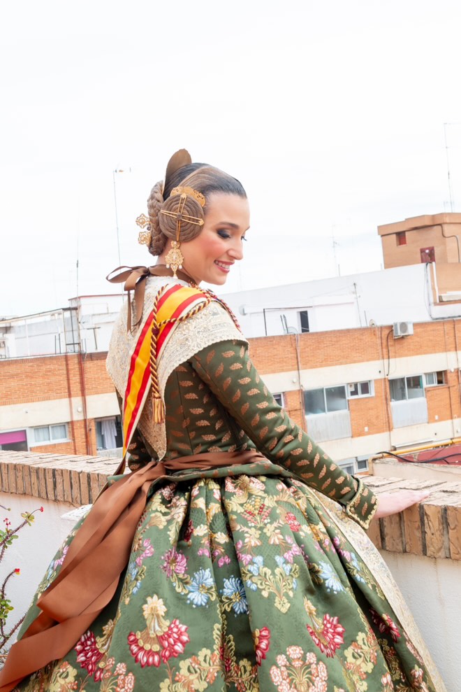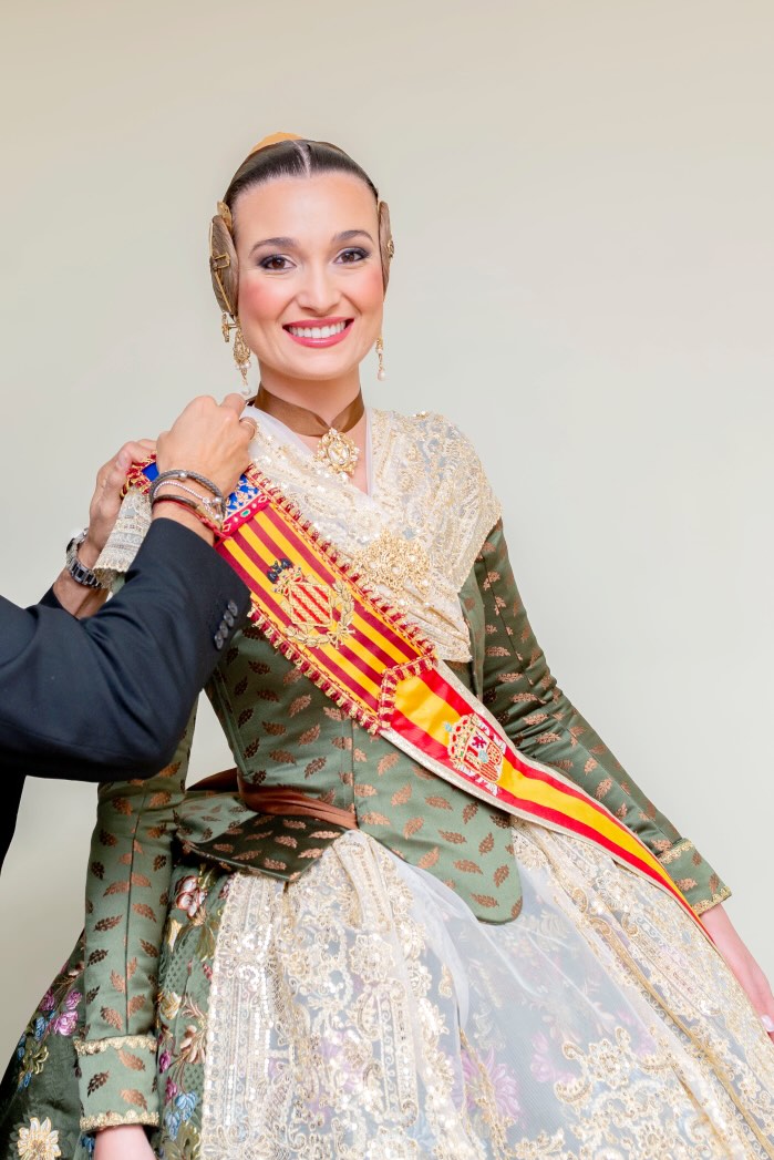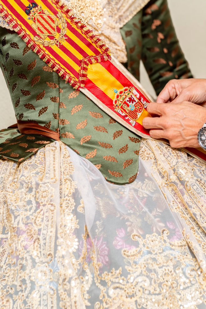 La elección de este diseño no solo enaltece la figura de la Fallera Mayor, sino que también simboliza el vínculo entre la indumentaria valenciana y la historia militar.