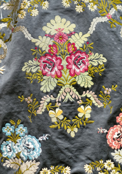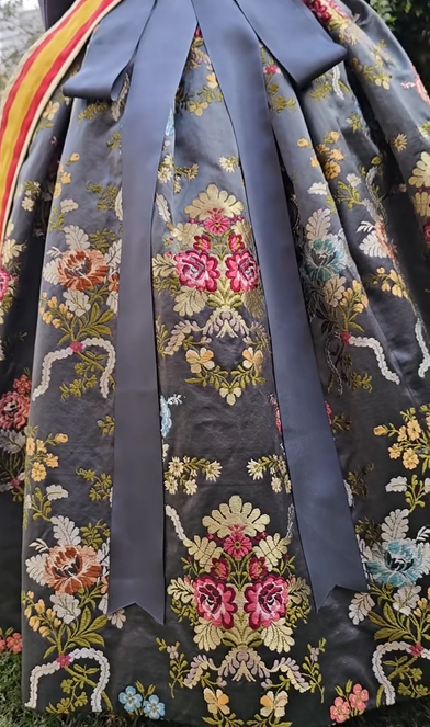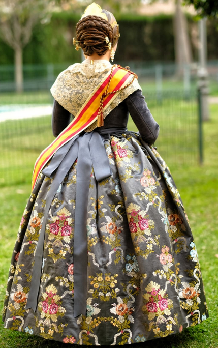 El espolín Francia es uno de los tejidos más emblemáticos de la indumentaria valenciana, caracterizado por su delicado dibujo y la riqueza de sus detalles. En esta ocasión, el tono gris grafito aporta una sofisticación especial, resaltando la profundidad y el relieve de cada trama, un testimonio del saber hacer de Telar Garín.