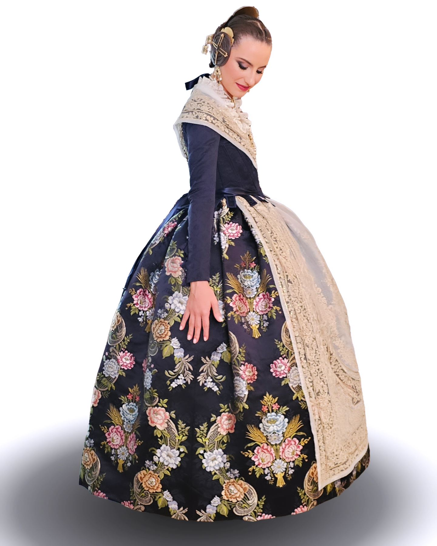 Negro azabache fue la elección de Laura Mengó para su espolín tejido. Espolines de Garín ha tejido con máquina jacquard de 400 agujas con simetría de espejo este espolín exclusivo reservado solo para las máximas representantes de la fiesta fallera.