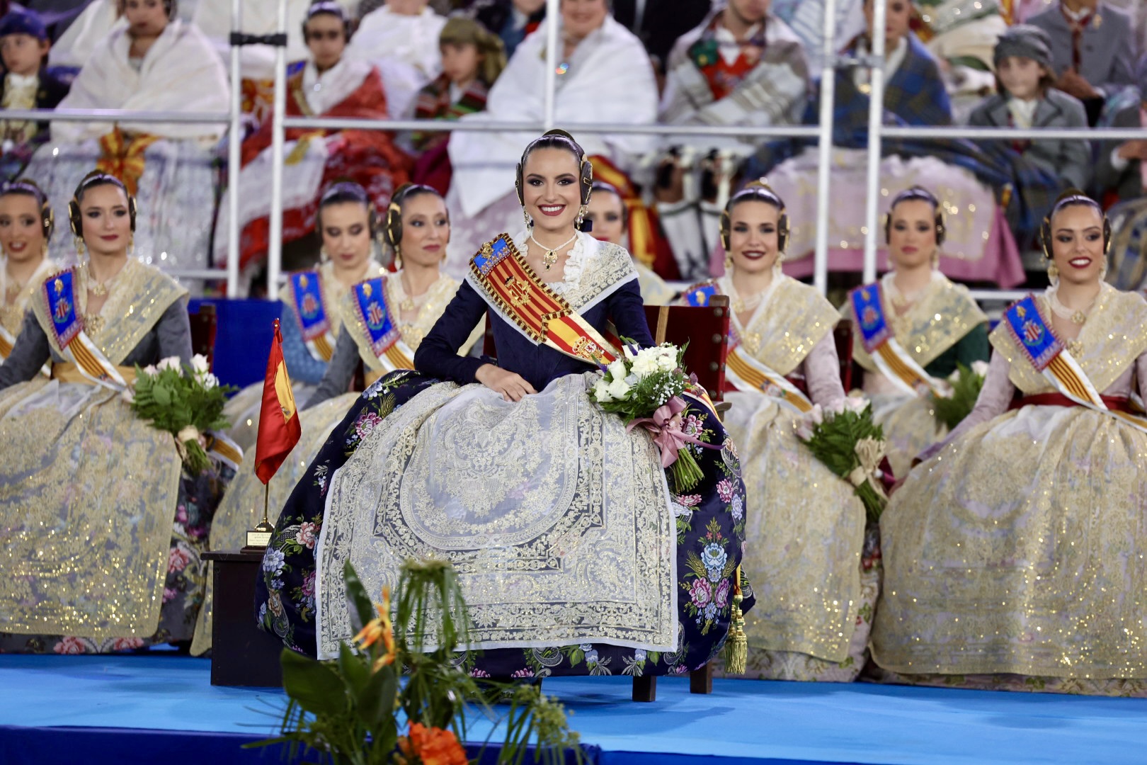 Un momento para el que la máxima representante de la fiesta fallera, María Estela Arlandis, ha estrenado un nuevo traje de valenciana. Para esta ocasión, la Fallera Mayor ha depositado toda su confianza en Eduardo Cervera, eligiendo un dibujo de su colección privada, en concreto el dibujo «Gran Gala» en azul infante, tejido en seda estrecha por Vives i Marí.