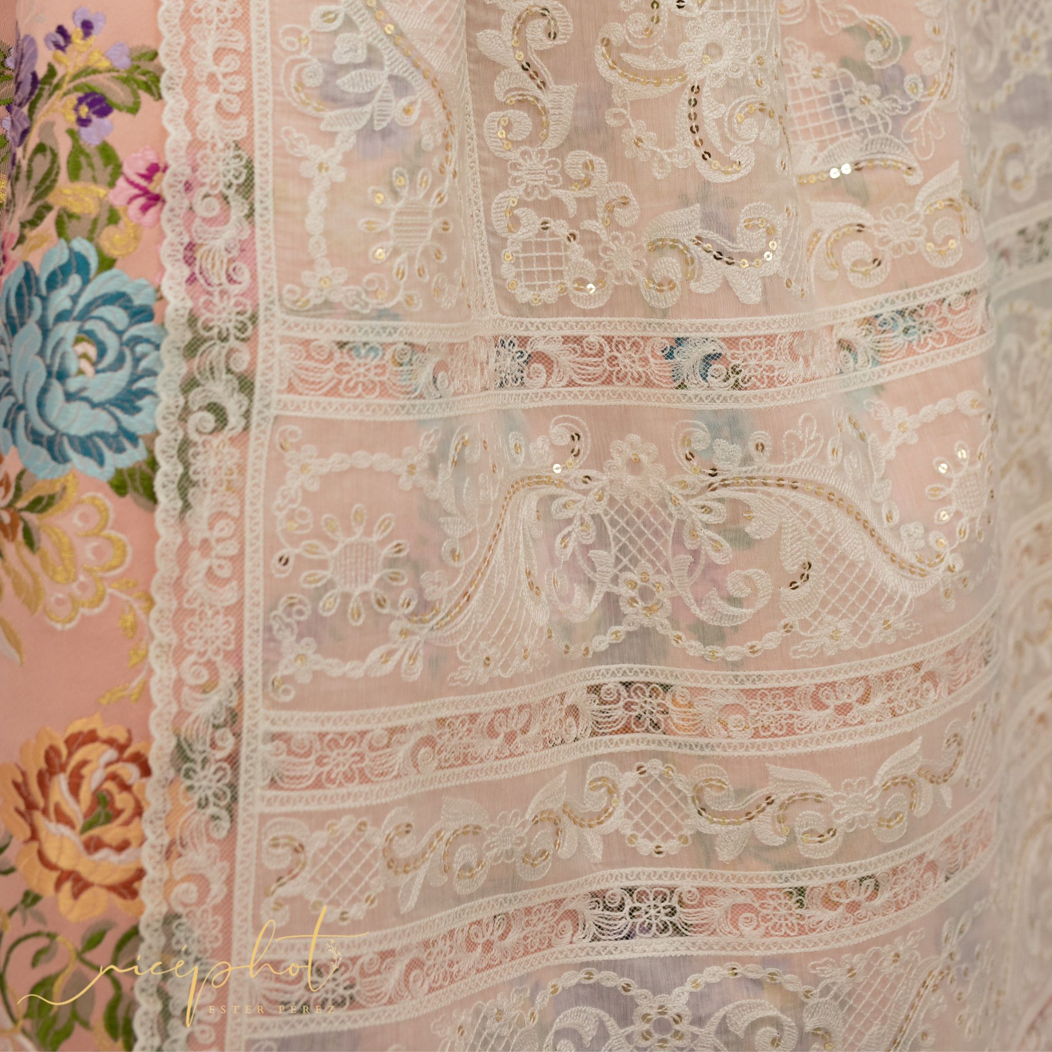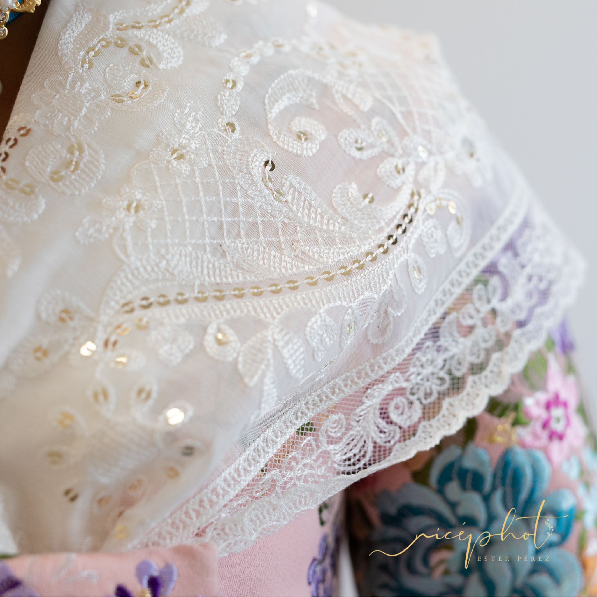 La representante del mundo fallero infantil portaba un jubón de mangas 3/4 con envarado de esparto interno. El jubón tiene tapeta en el delantero rematada con lazos. Artesanía Viana firma unas manteletas lenceras, bordadas en hilo ecológico color tostado, sobre una Batista fina, lleva puntillas y entredoses sobre tul, la lentejuela es de metal dorado y en el fibujo predominan las palmas tradicionales.