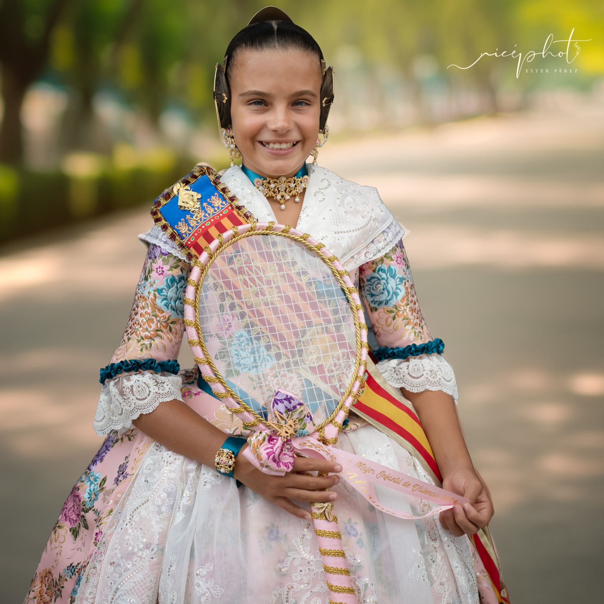 Para este evento, Marina García Arribas, Fallera Mayor Infantil de València 2024, ha estrenado un nuevo vestido de valenciana. Se trata de un tejido estrecho de Vives y Marí, con fondo en color salmón, todo ello confeccionado por su indumentarista de referencia, Irene de Segles Indumentaria Valenciana.