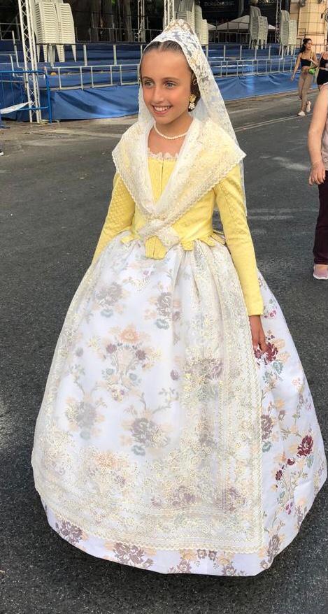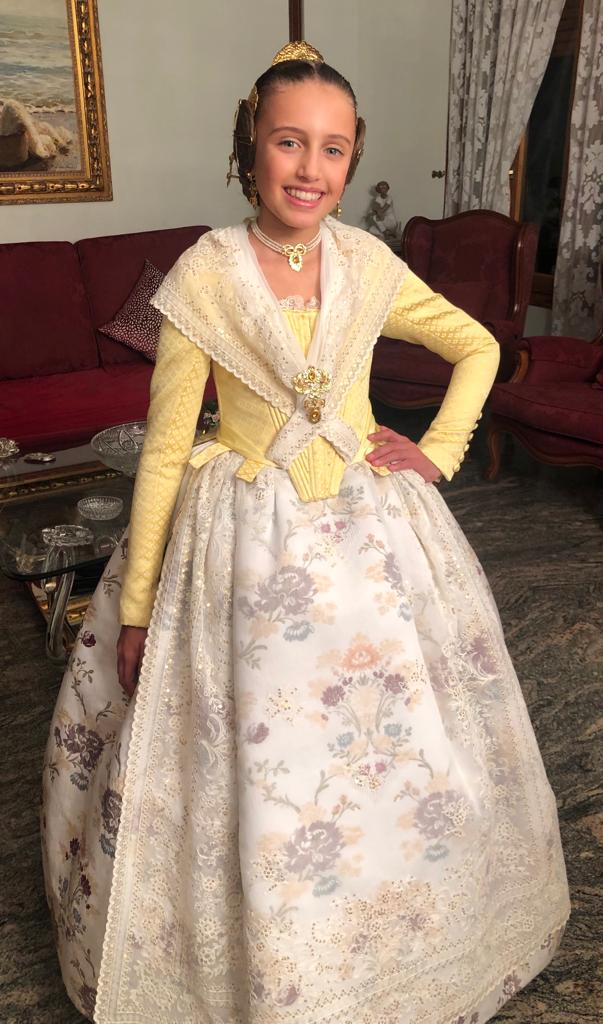 El segundo traje que Alba ha estrenado este año está tejida en los telares de Vives y Marí. Se trata del dibujo Enzo, en color blanco, con un colorido realizado para que ella pudiese llevar el jubón que su madre utilizó como Fallera Mayor de Valencia, utilizando la seda y rehaciendo el patronaje especialmente para Alba, en color limón.