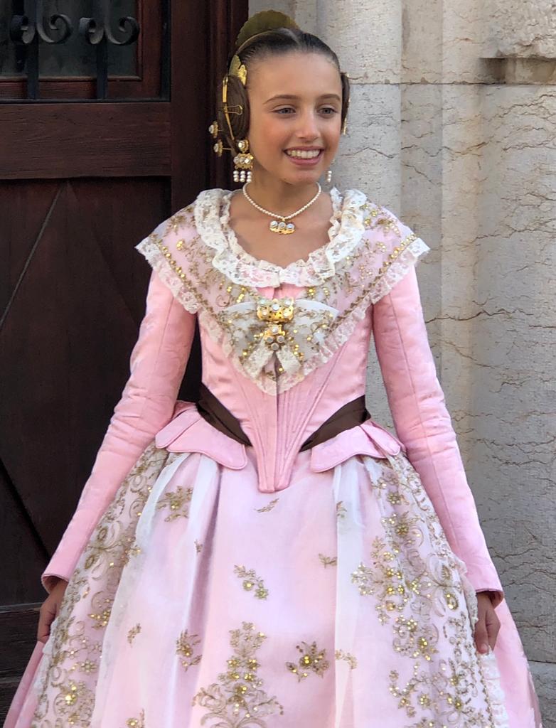 Otra de las grandes joyas que está luciendo Alba es el damasco rosa con cintas marrones. Esa combinación tiene historia porque hace referencia al espolín Fallera Mayor de Valencia de su madre Lucía Gil, que destacó por la originalidad de la combinación de las cintas marrones.