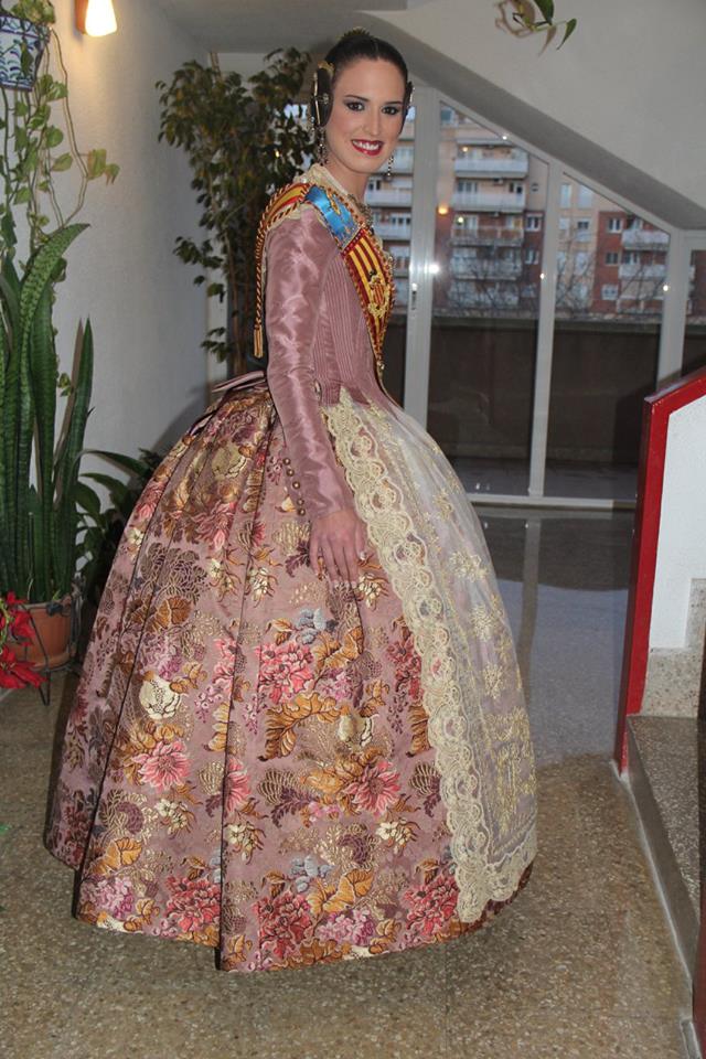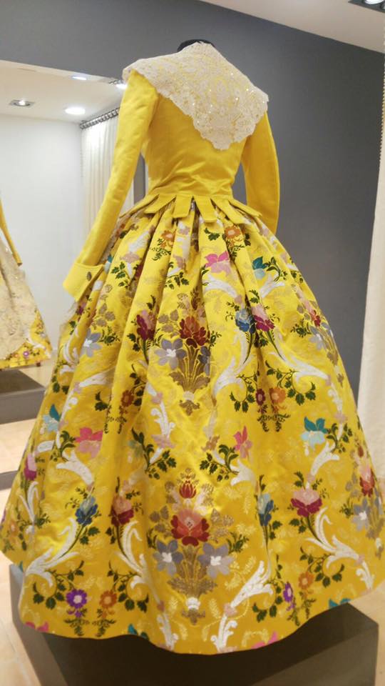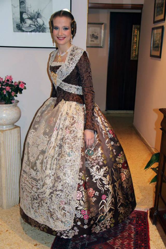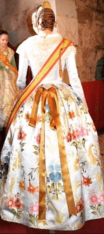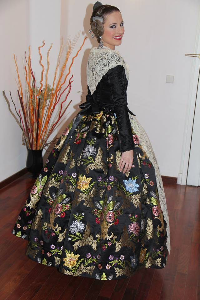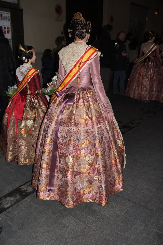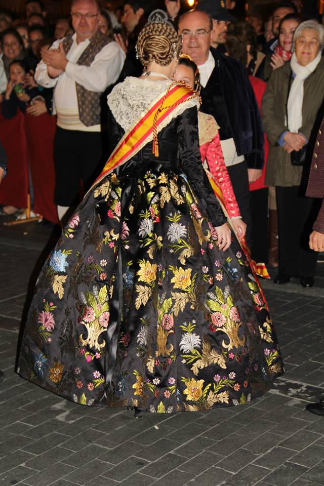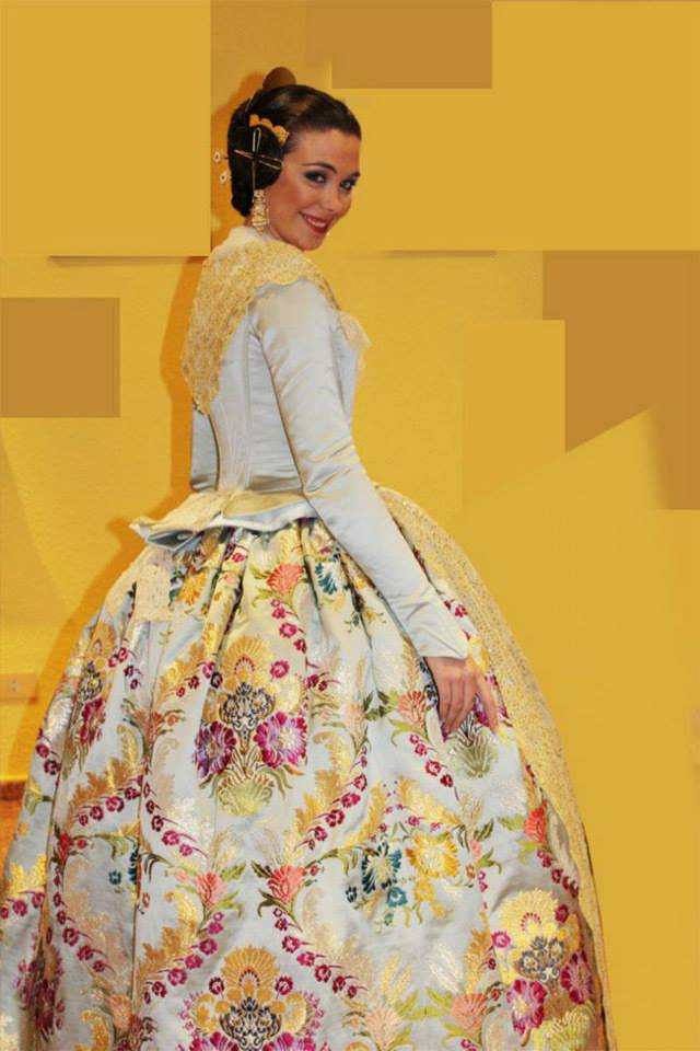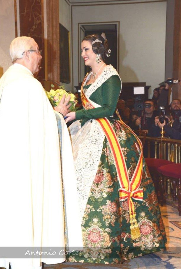 Consuelo Llobell sorprendía con una seda estrecha en color ‘Verde Túria’ de Vives y Marí con metal en oro blanco. Confeccionado por Marian Indumentaria se trata de un modelo del siglo XVIII con envarado interior siguiendo patrones clásicos de la época con almenas en la cintura.