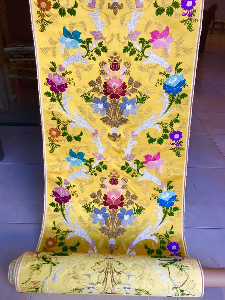 Lampas de seda amarillo con dibujo pequeño de guirnalda.