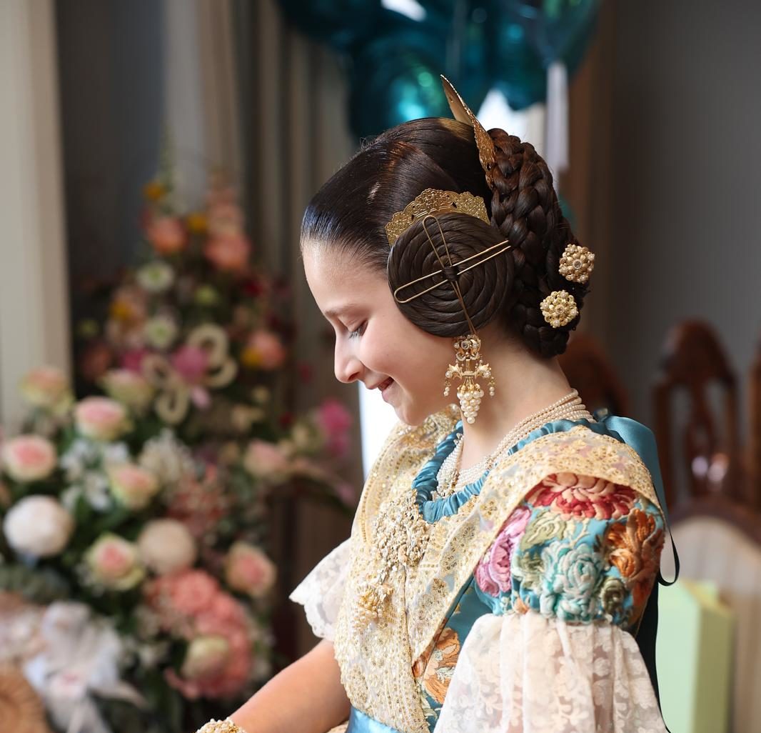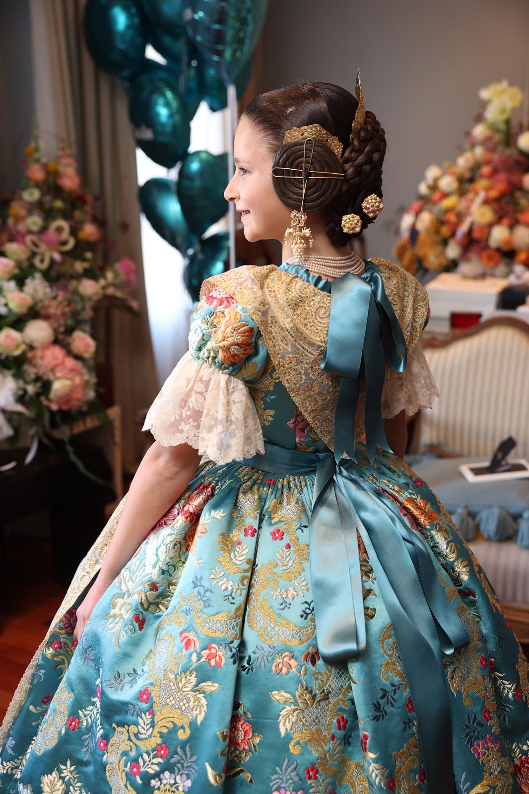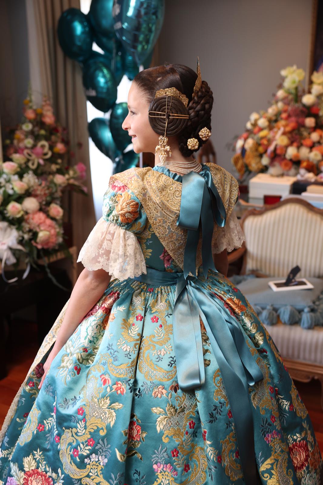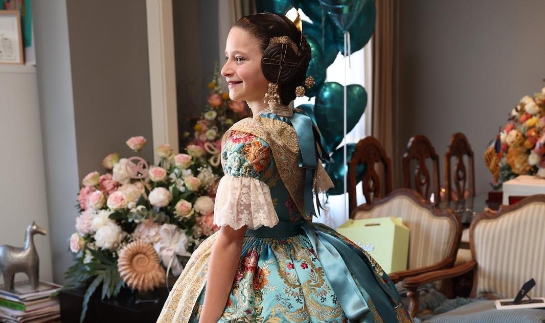 Para esta ocasión tan especial, Marta Mercader Roig ha elegido el tono Azul Cristalino, un color cargado de simbolismo que evoca pureza, frescura y luminosidad. Un matiz que conecta con la claridad del día, la serenidad del cielo valenciano y la ilusión que rodea a la infancia fallera.