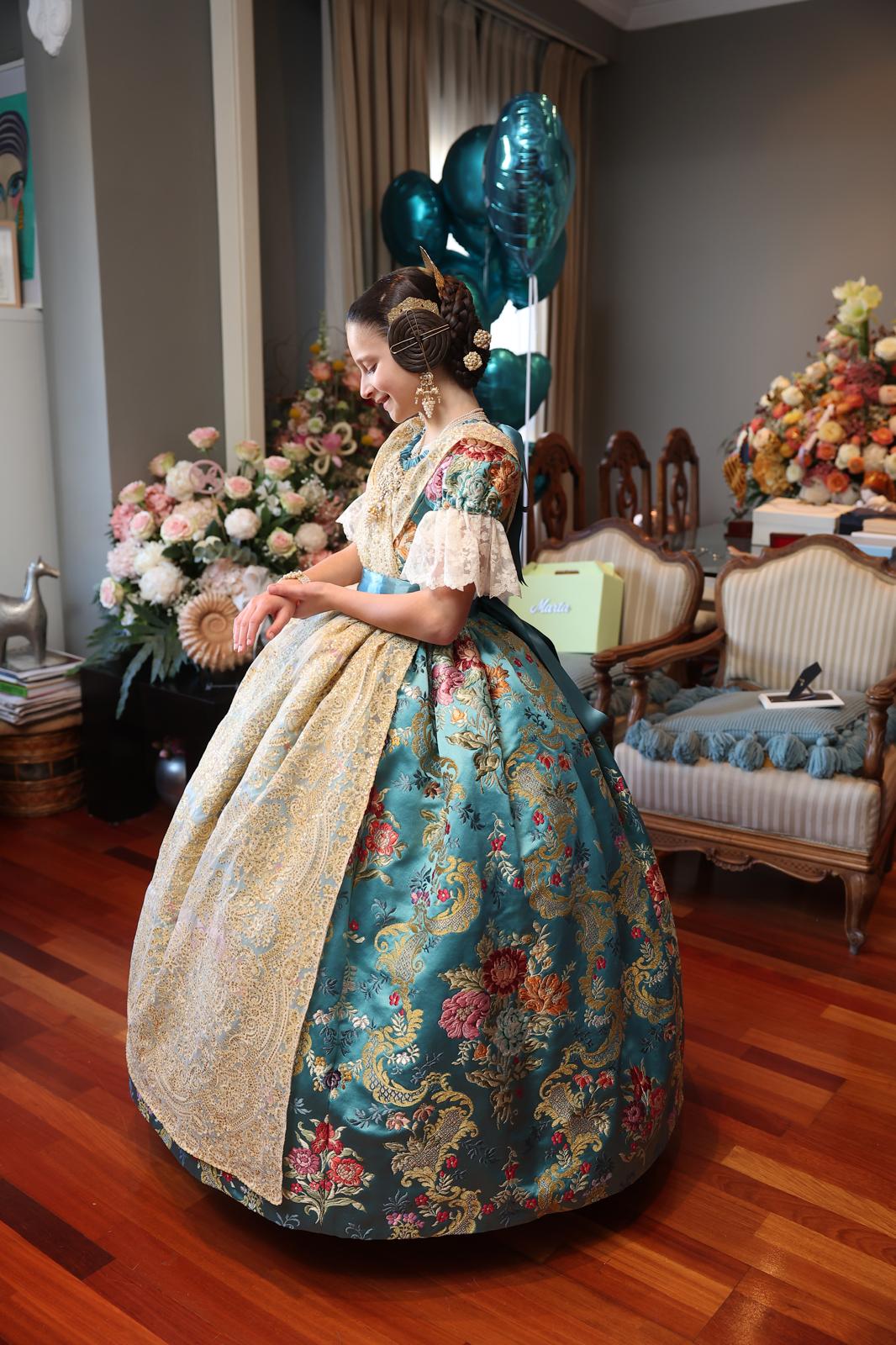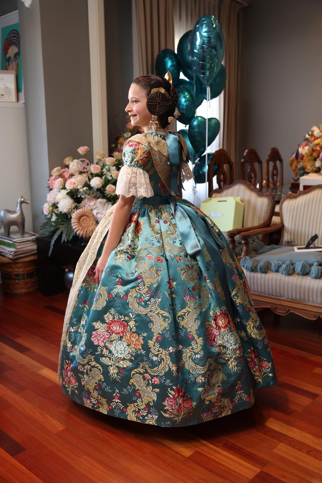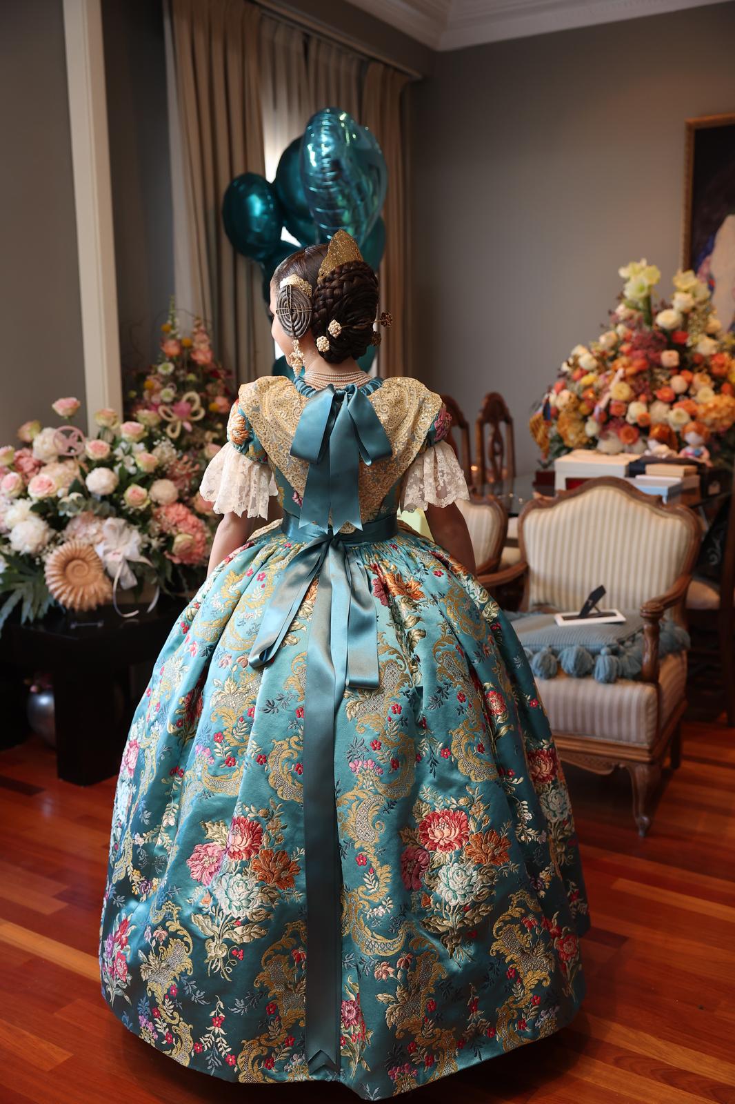 El tono azul cristalino ha sido escogido por su fuerte carga simbólica, ya que representa pureza, frescura y luminosidad, cualidades que reflejan a la perfección la esencia de Marta Mercader como fallera mayor infantil de València 2026. Inspirado en el azul cristalino del inicio del día, este matiz natural de urdimbre transmite alegría y serenidad, integrándose con elegancia en el conjunto floral del tejido.