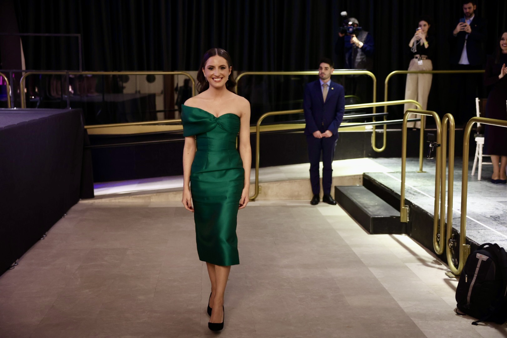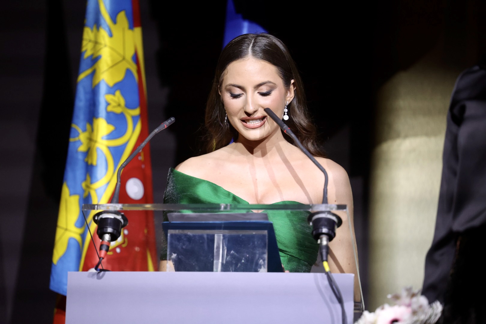 Se trata de un vestido en color verde esmeralda de corte recto, palabra de honor, con drapeado en un costado, simulando una lazada que termina en la espalda. El look lo completaba con unos favorecedores pendientes de brillantes de Argimiro Aguilar.