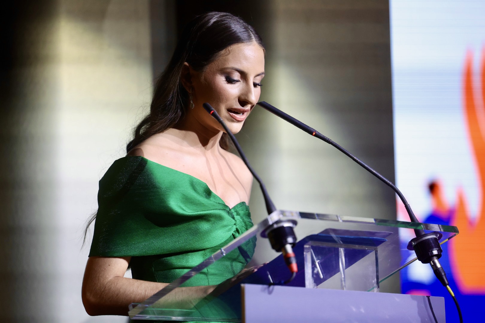 Se trata de un vestido en color verde esmeralda de corte recto, palabra de honor, con drapeado en un costado, simulando una lazada que termina en la espalda. El look lo completaba con unos favorecedores pendientes de brillantes de Argimiro Aguilar.