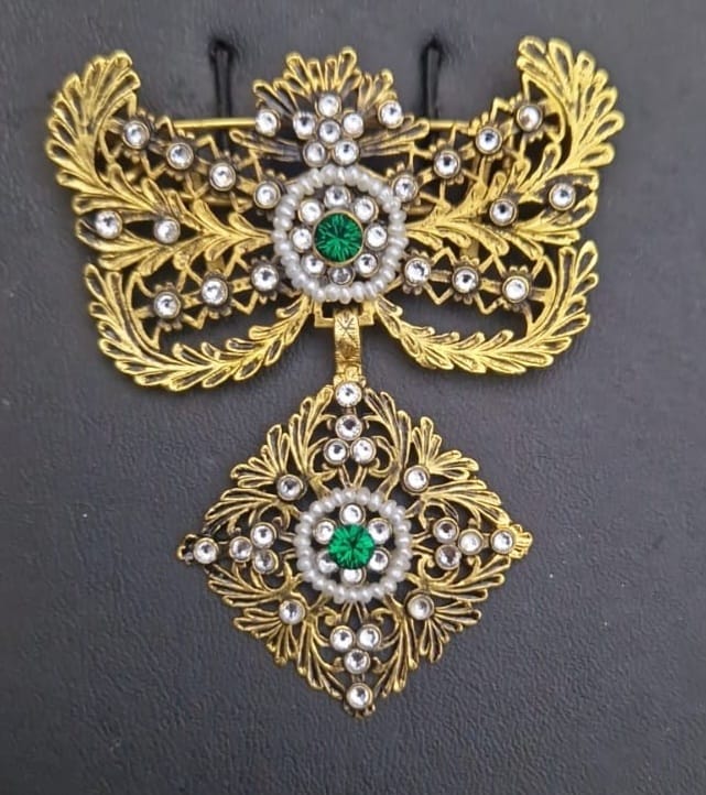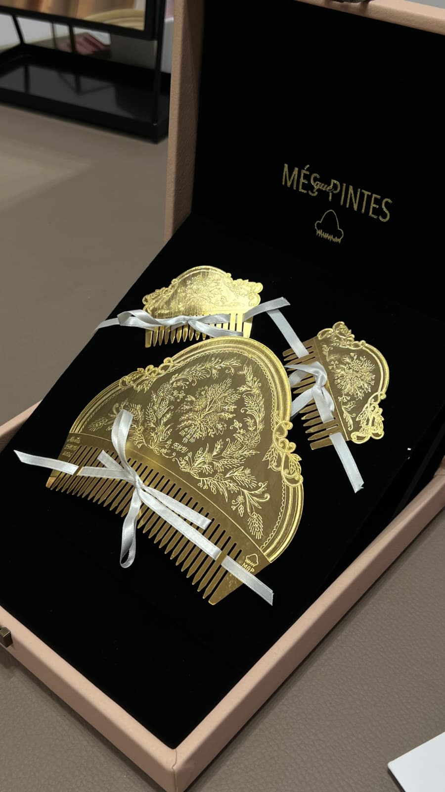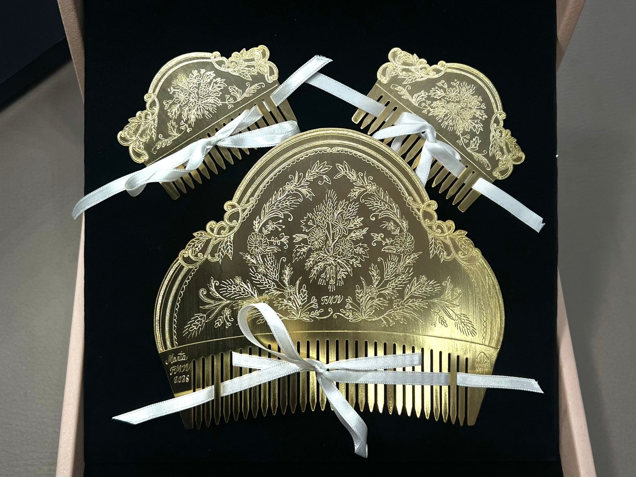Nace en el taller de Més que Pintes,  una pieza artesanal única, compuesta por motivos florales, hojas y espigas, que se combinan armoniosamente con volutas ornamentales en el borde, otorgándole un estilo clásico y elegante. Cada peineta está chapada en oro y elaborada con la técnica tradicional de raspado a buril, garantizando un acabado delicado y exclusivo que resalta la maestría de estos artesanos.