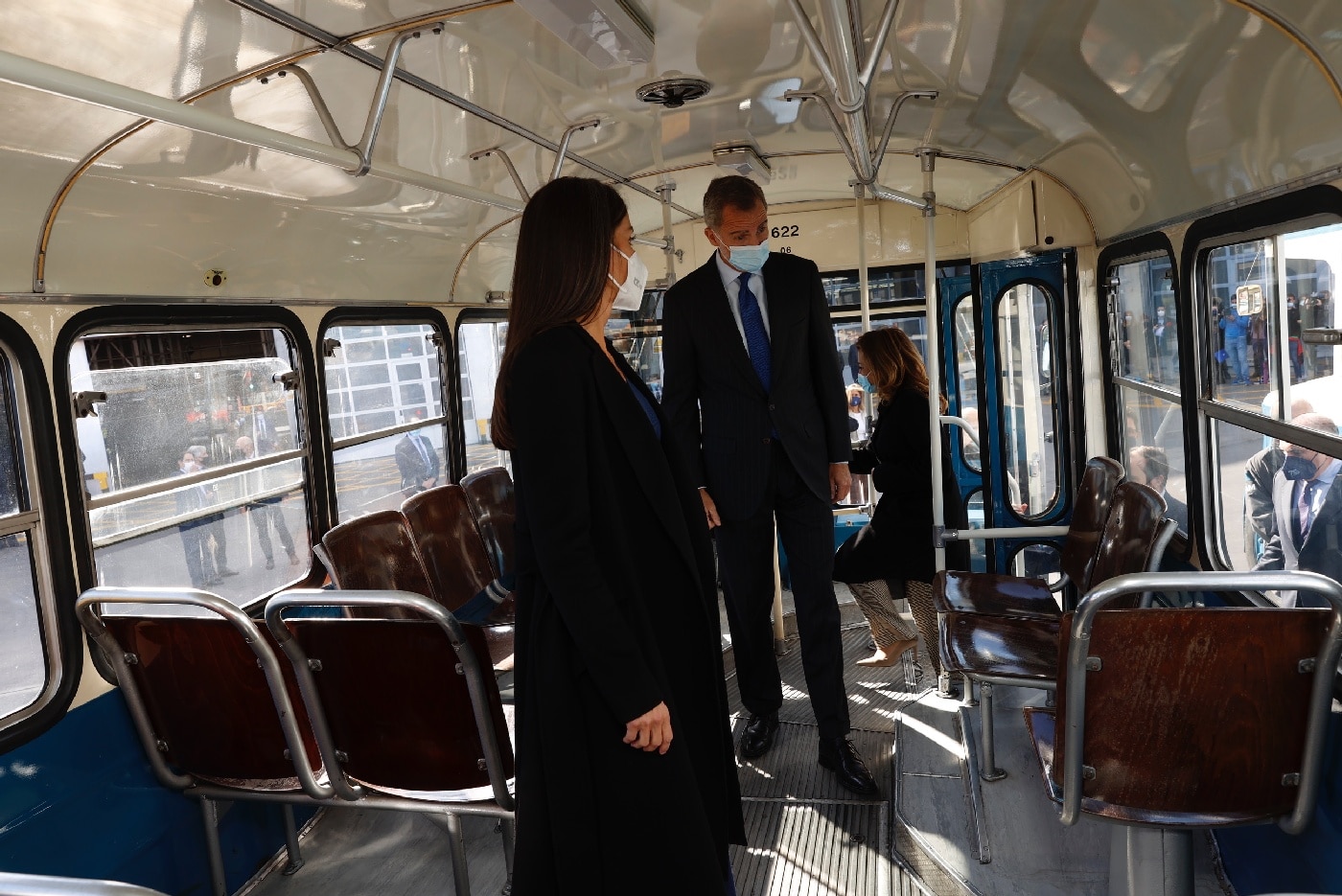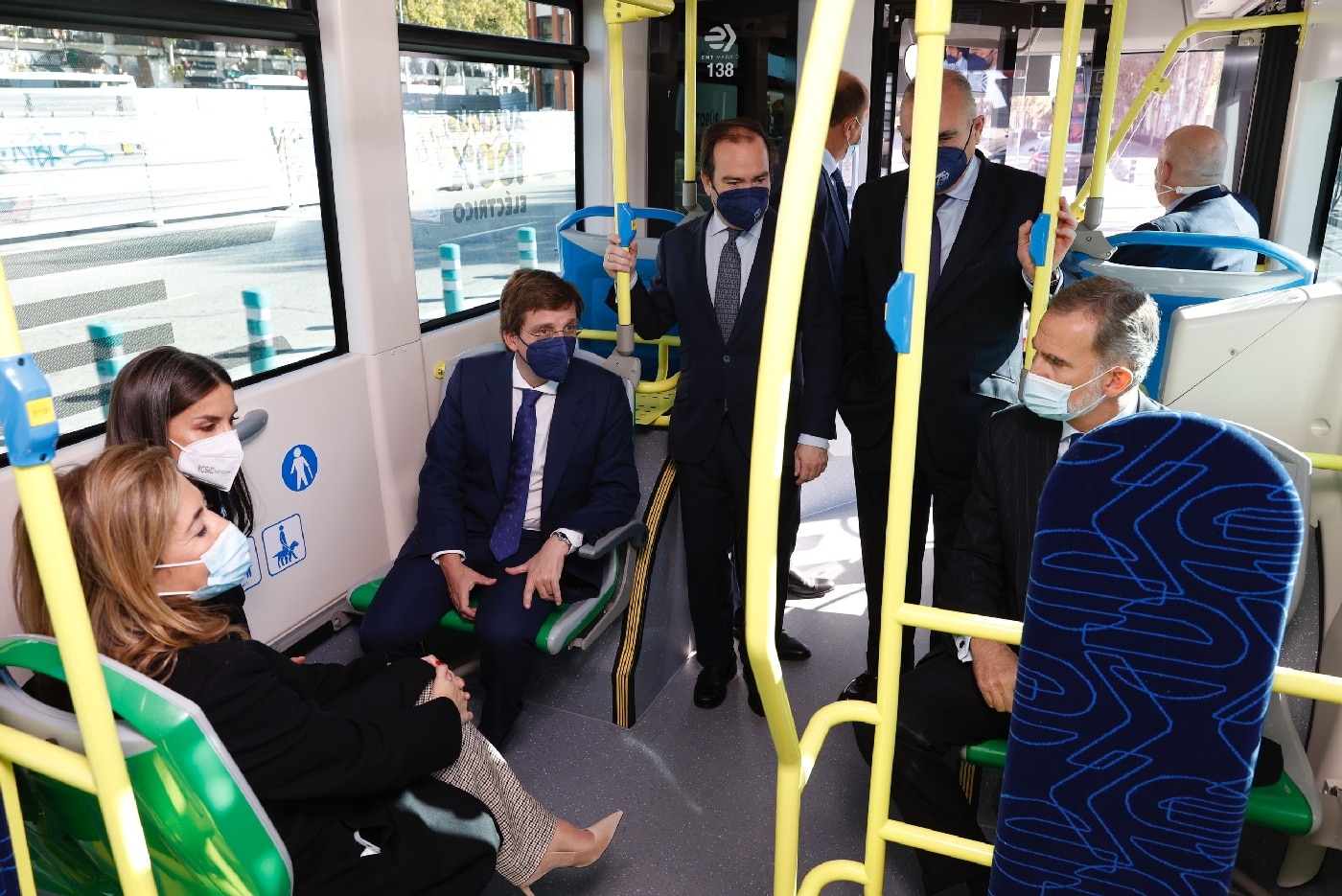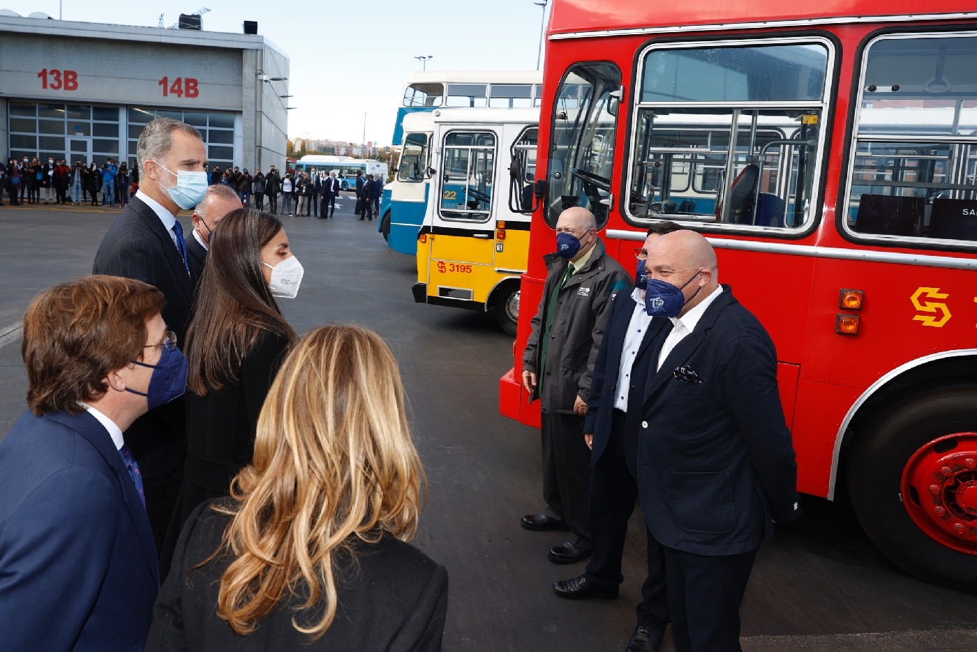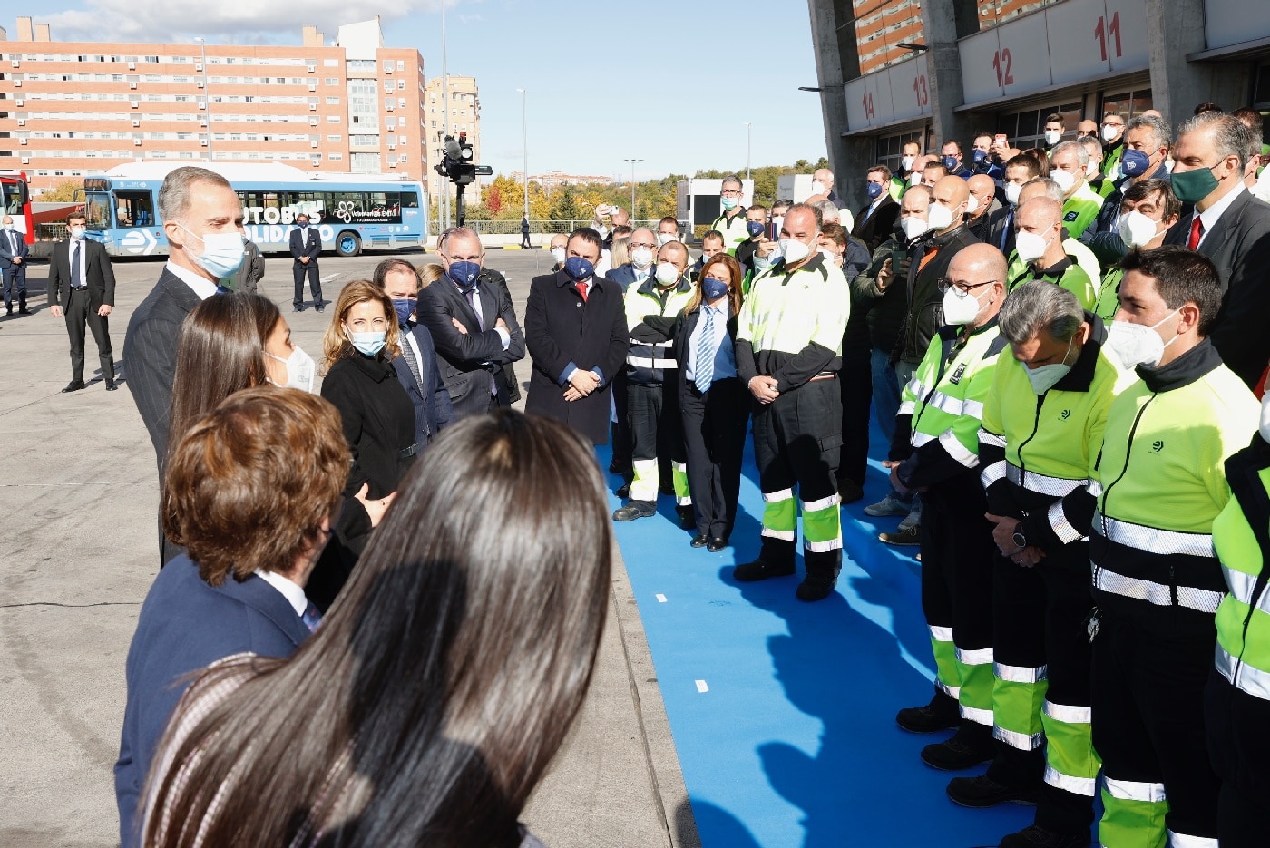 Don Felipe y Doña Letizia continuaron en el autobús hasta el Centro de Operaciones de la EMT en Carabanchel, donde fueron recibidos por la vicealcaldesa de Madrid, Begoña Villacís; miembros de la Junta de Portavoces del Ayuntamiento de Madrid; miembros del Consejo de Administración, y miembros del Comité de Dirección.