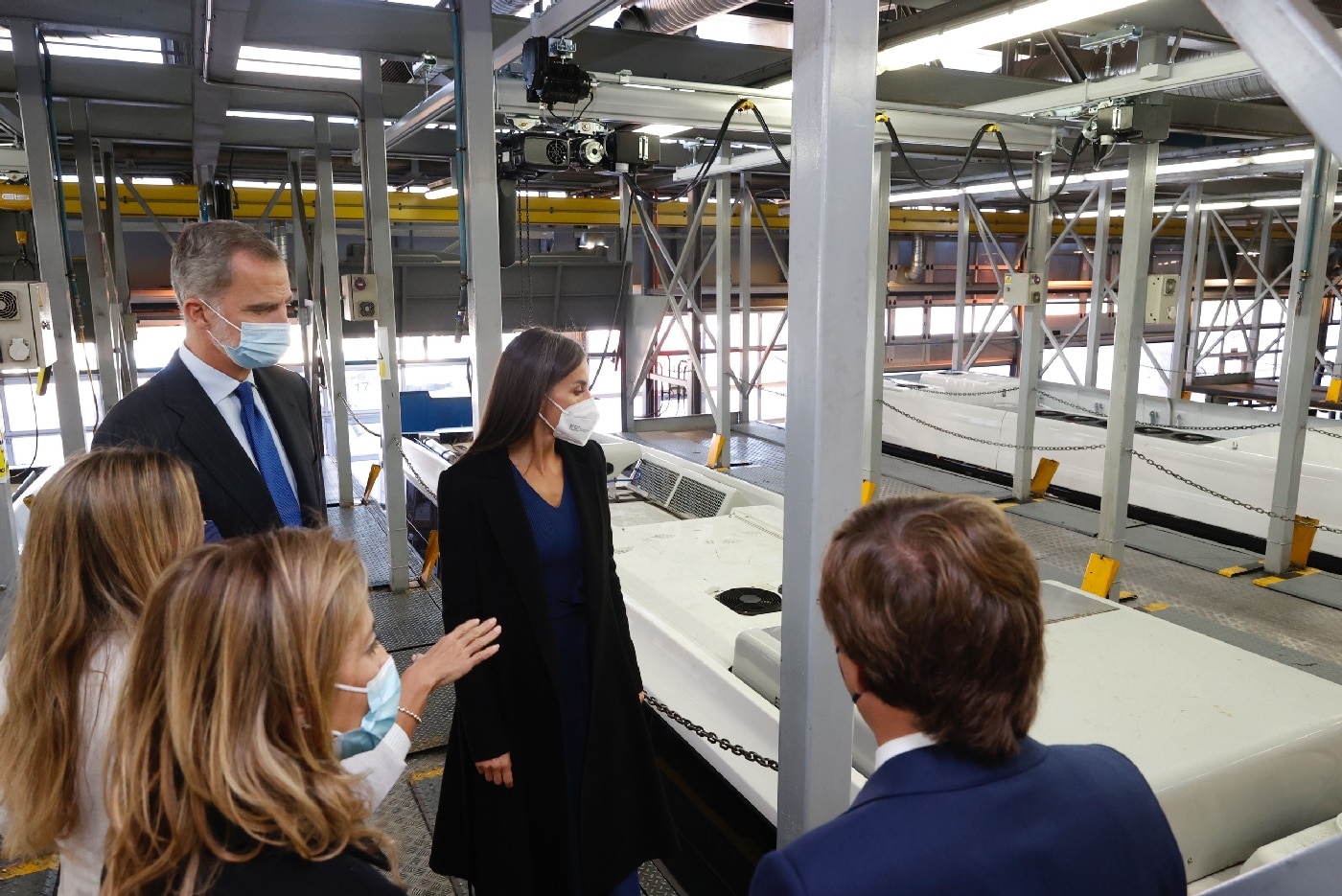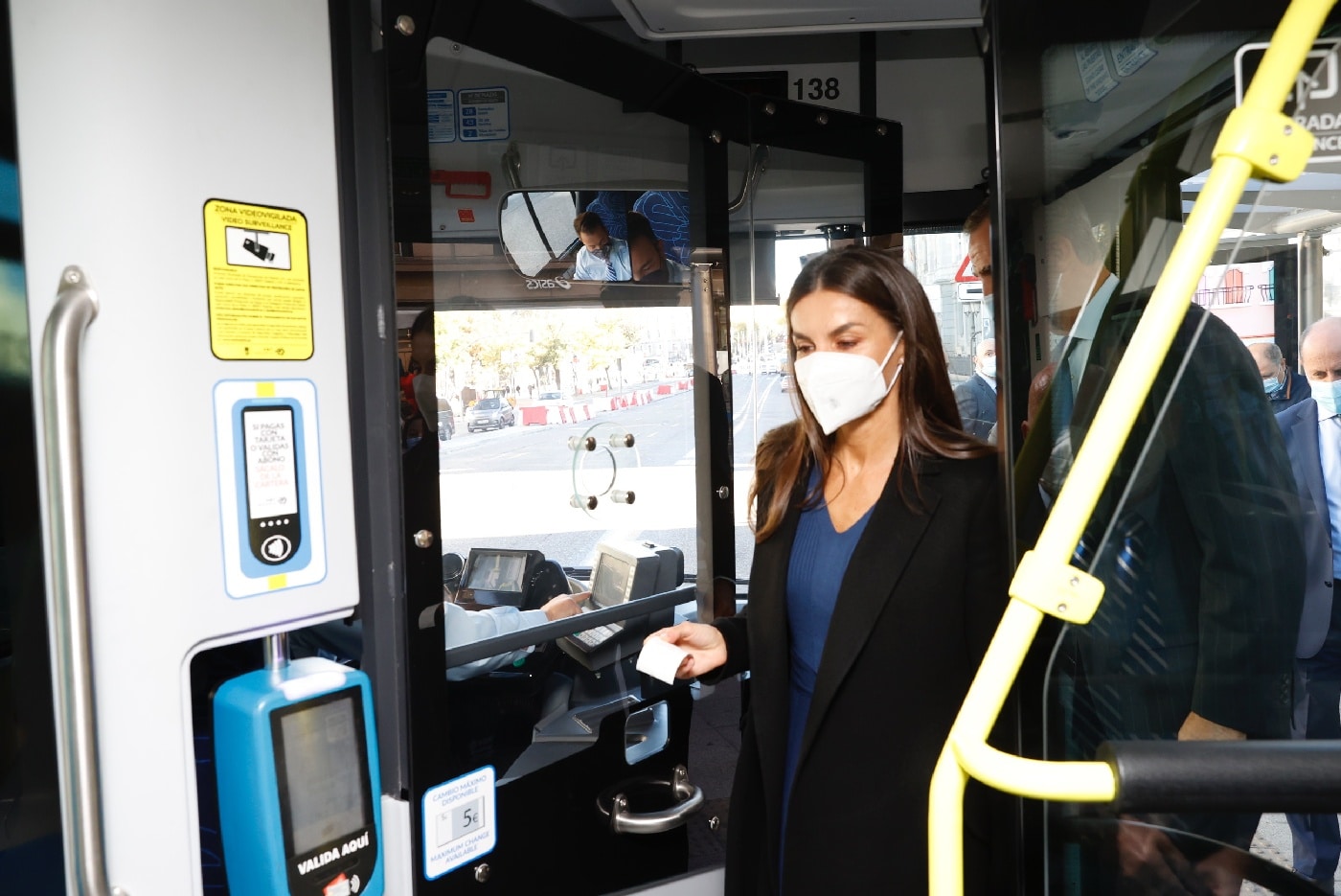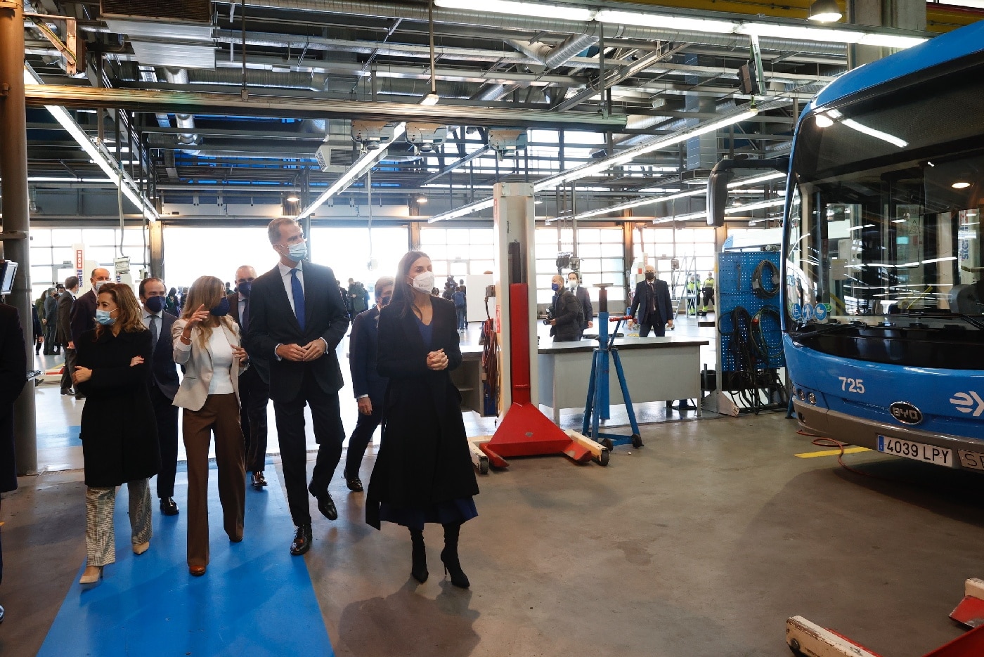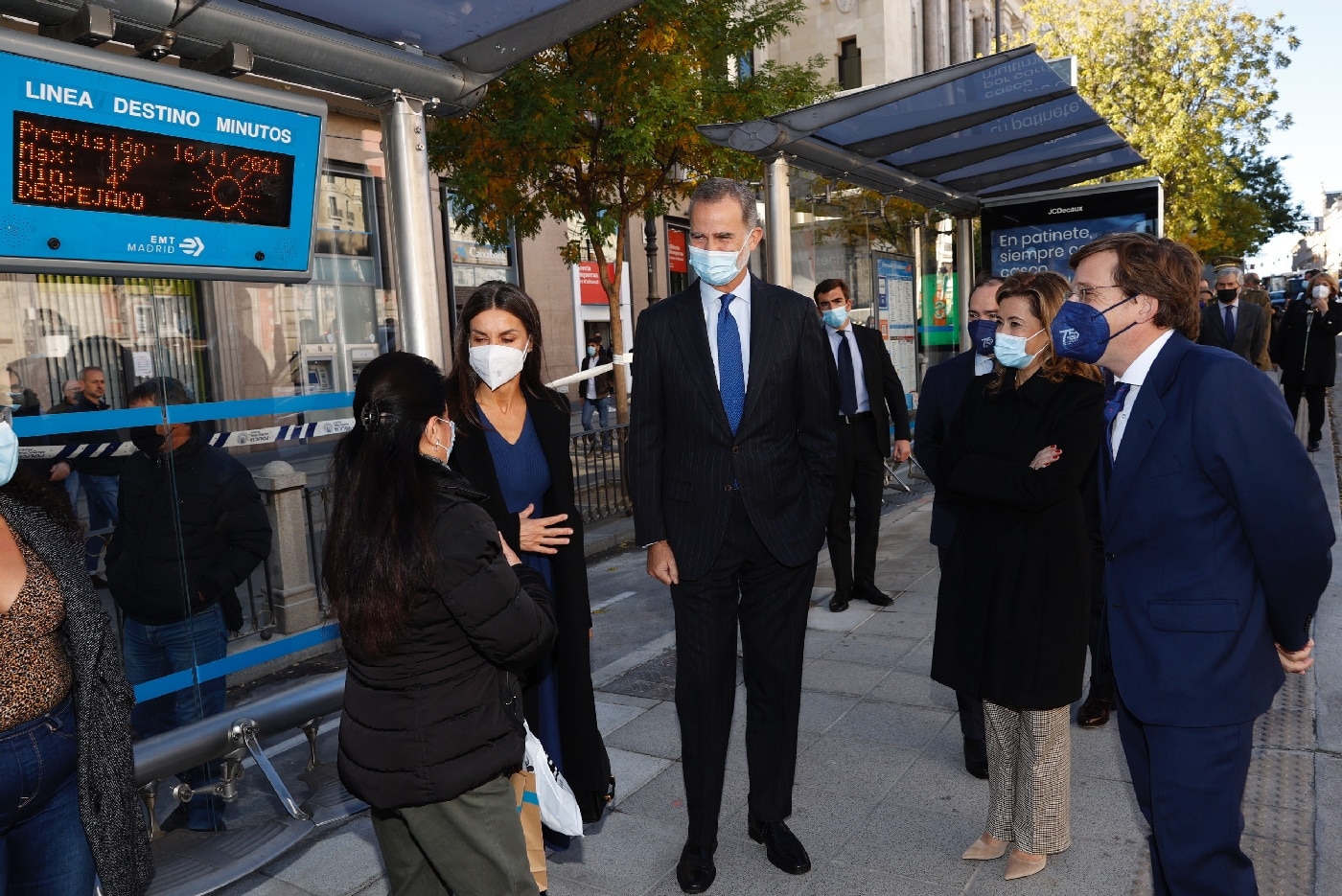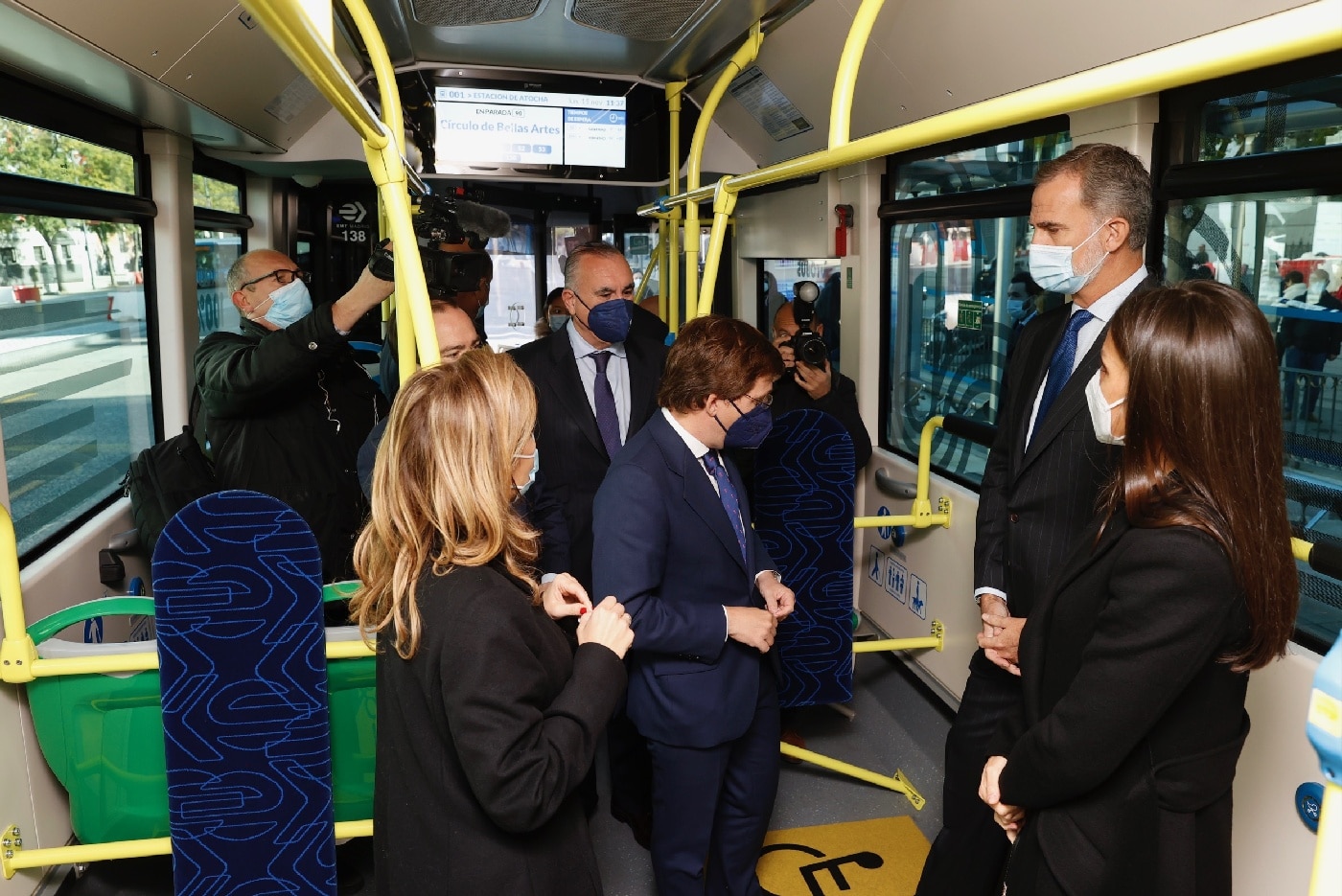 Don Felipe y Doña Letizia continuaron en el autobús hasta el Centro de Operaciones de la EMT en Carabanchel, donde fueron recibidos por la vicealcaldesa de Madrid, Begoña Villacís; miembros de la Junta de Portavoces del Ayuntamiento de Madrid; miembros del Consejo de Administración, y miembros del Comité de Dirección.