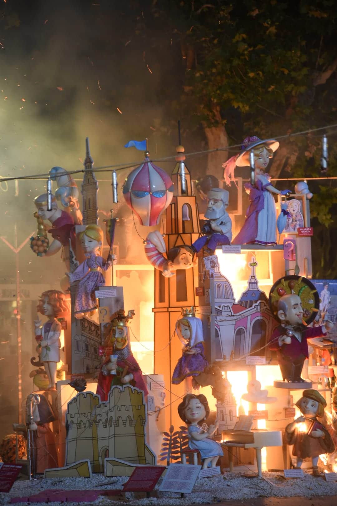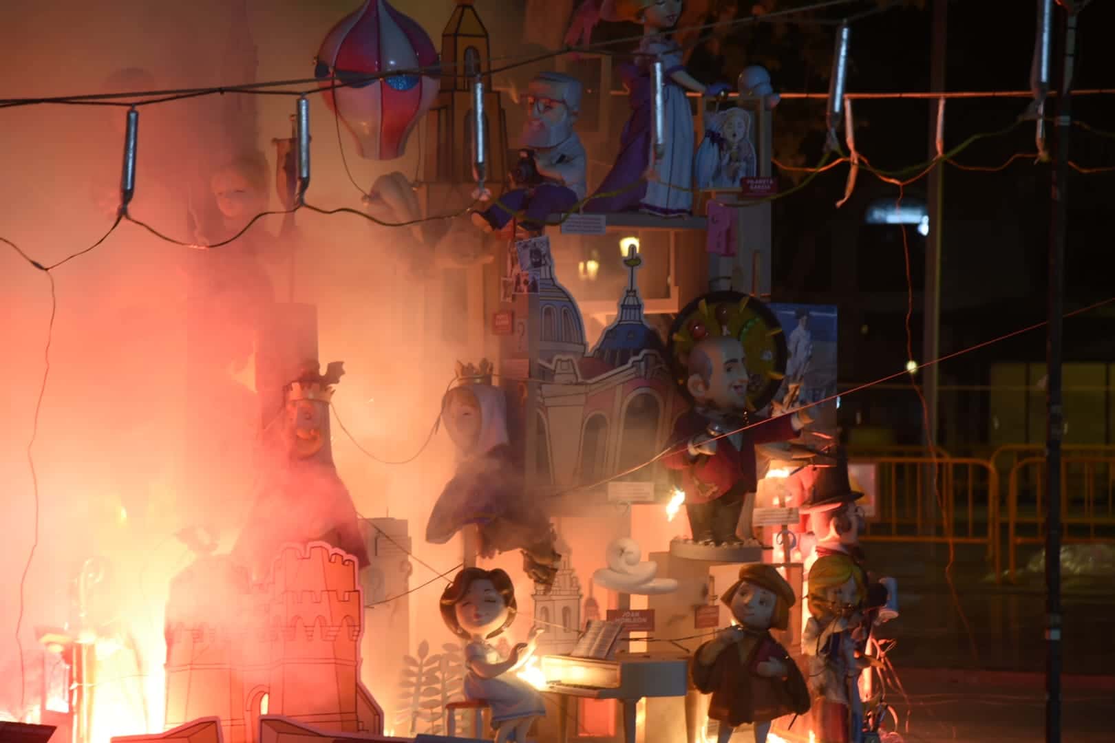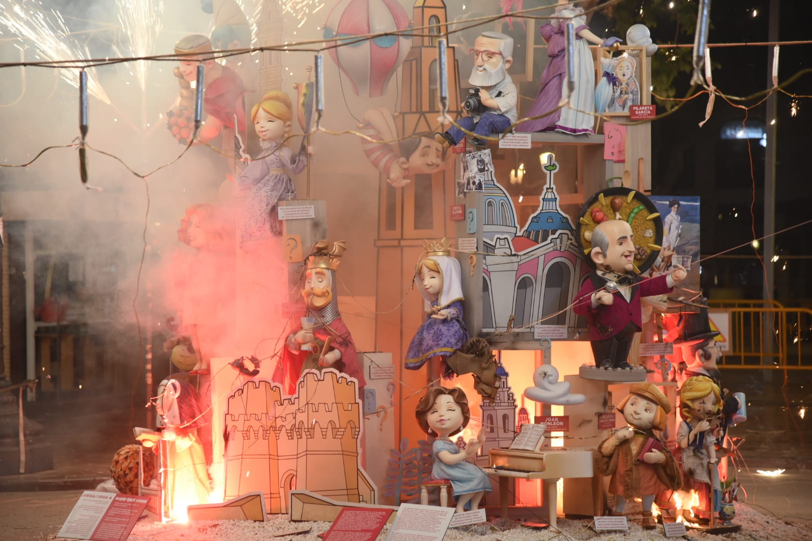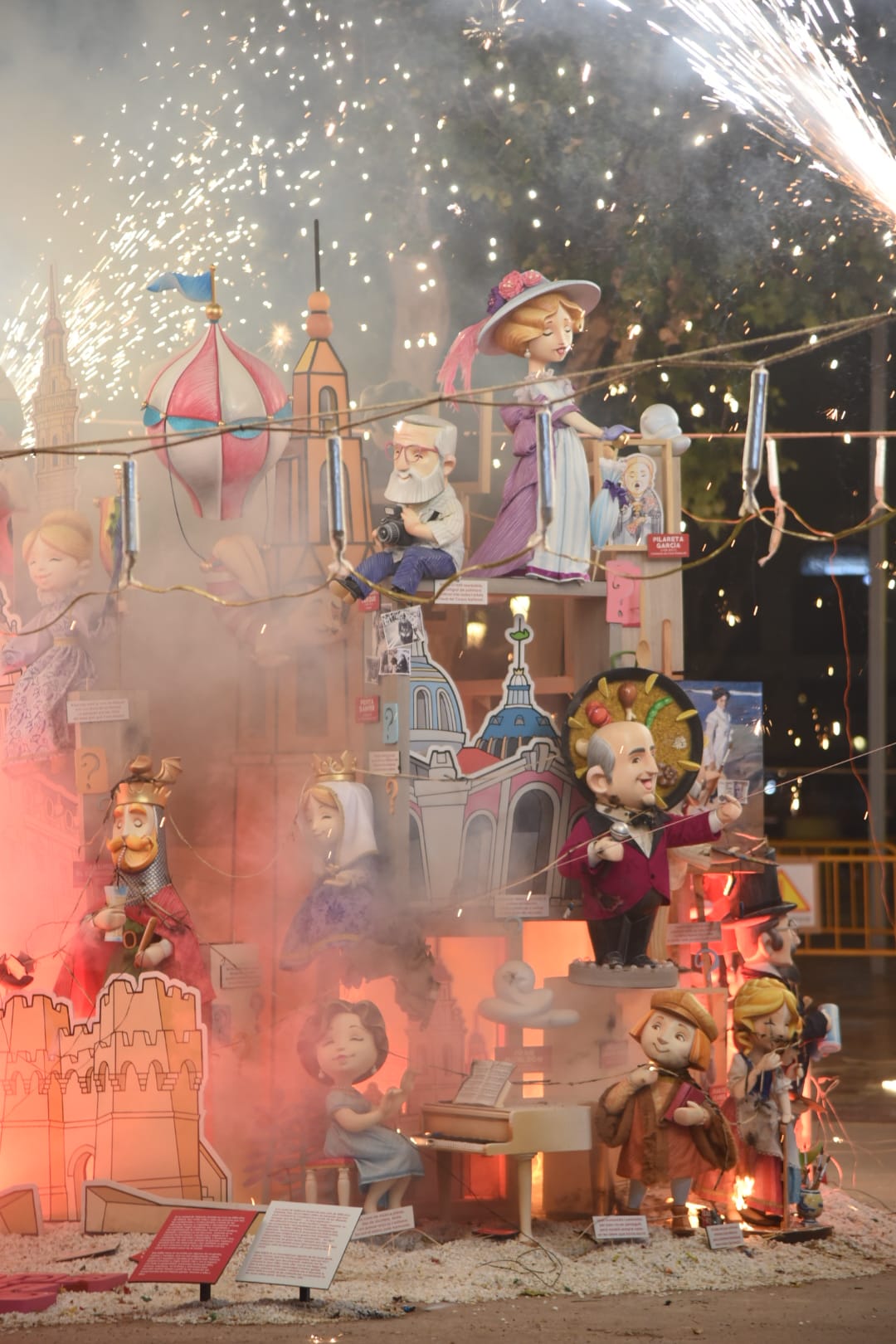 Y a las nueve ha comenzado a arder la falla municipal infantil -que, como la grande, no entra en competición con el resto-, una de las más visitadas y fotografiadas este año gracias al trabajo que han llevado a cabo los artistas José Luis Ceballos y Francisco Sanabria con el lema «Saps qui sóc?» (¿sabes quién soy?), homenaje a grandes personajes de la historia de la ciudad.