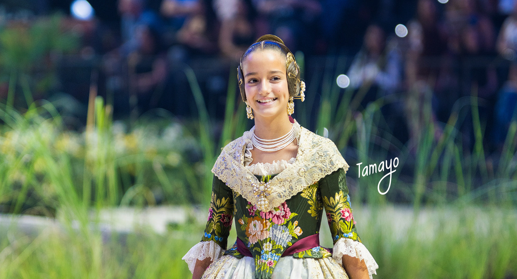 En el acto de la Elección, María deslumbró con un traje en color verde hiedra, confeccionado por Eduardo Cervera con una tela Lampas de seda “Magdalena” de Compañía Valenciana de la Seda. Un elegante aderezo de Daniel Bada completaba el conjunto, reflejando la combinación de historia, artesanía y modernidad que tanto caracteriza a la indumentaria valenciana.