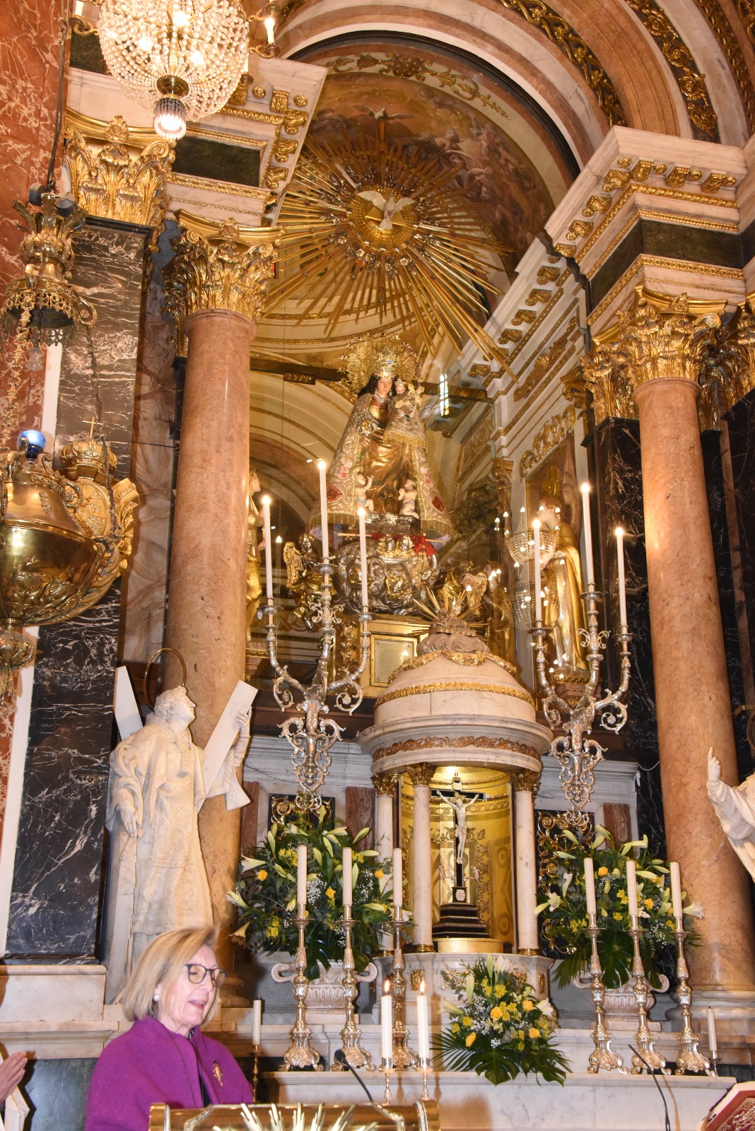 La imagen original de la Virgen de los Desamparados que preside el altar mayor de la Basílica luce desde ayer tarde la “Joia” que le regalaron las Falleras Mayores y Mayores Infantiles de Valencia que participaron el pasado 4 de febrero en una celebración especial con motivo del Año Jubilar Mariano del Centenario de la Coronación.