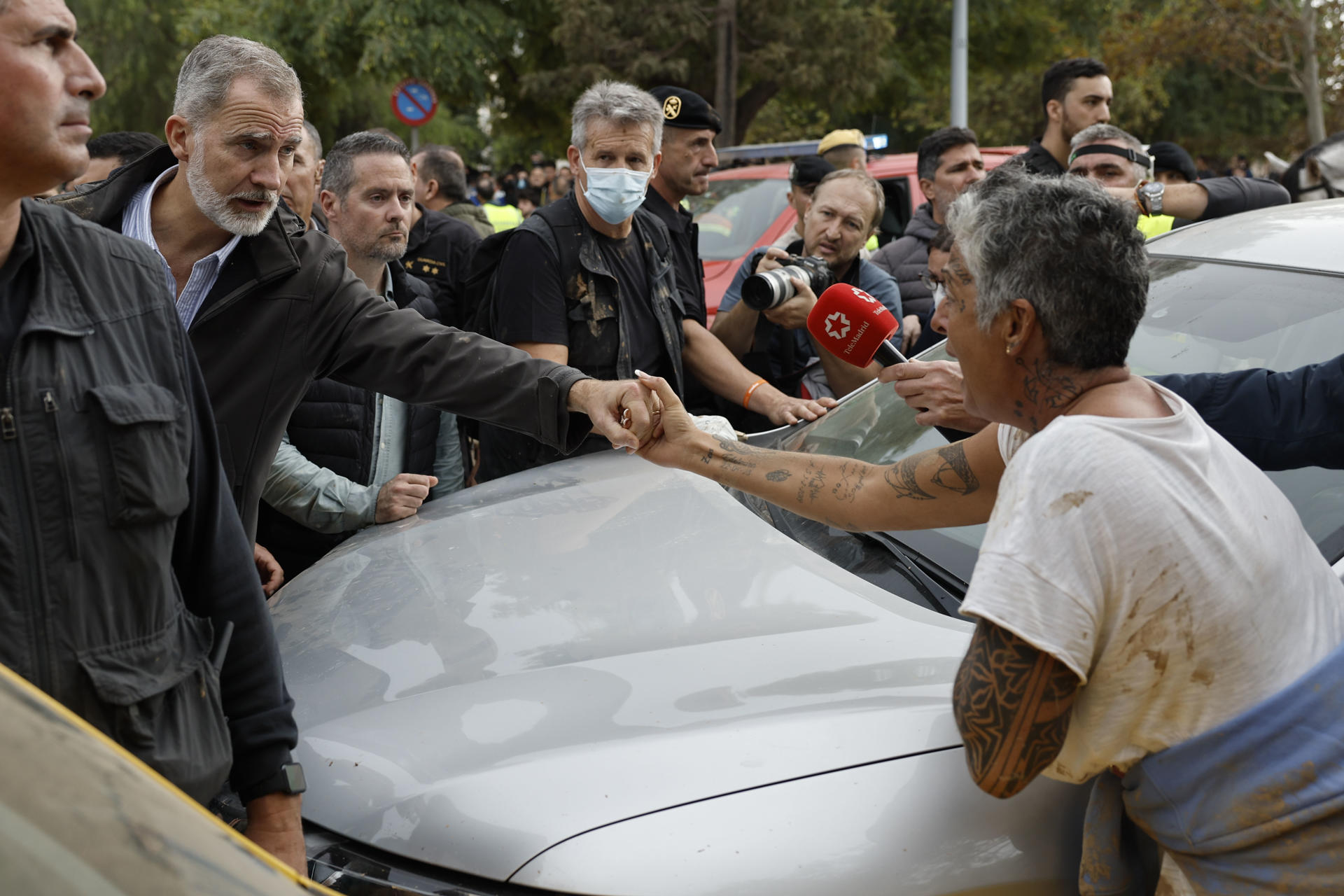 Los voluntarios se han encarado con el rey y el resto de políticos, y don Felipe y doña Letizia, ya sin paraguas y cada uno por su lado, han detenido el paso para hablar con algunos de los jóvenes que se les acercaban muy alterados, con el propósito de tranquilizarles.