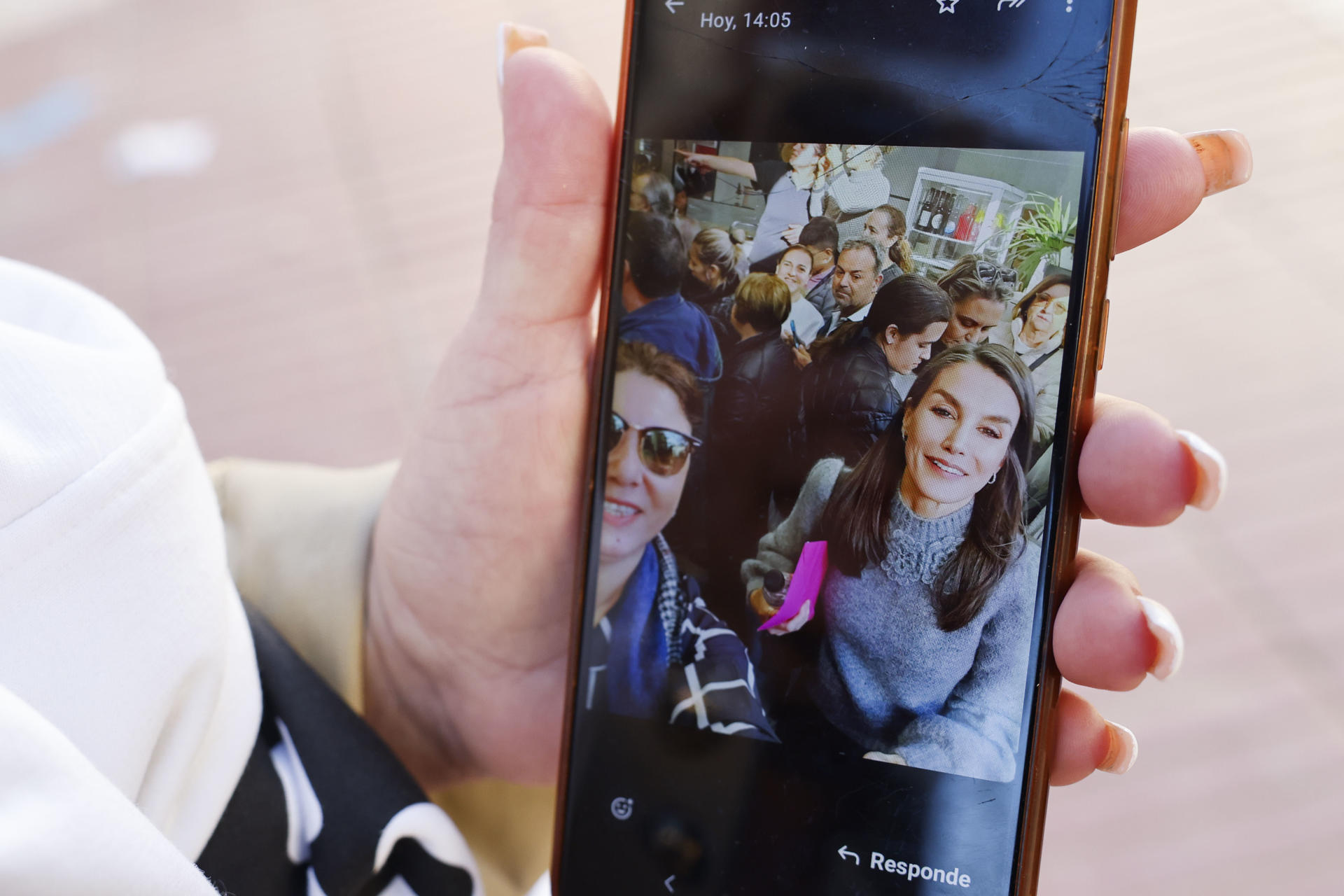 Una vecina de Catarroja muestra una foto de la visita que los reyes Felipe y Letizia, acompañados por sus hijas, la princesa Leonor y la infanta Sofía, han realizado este domingo por sorpresa a Catarroja (Valencia), una de las localidades afectadas por la dana, en una visita privada. EFE/Ana Escobar